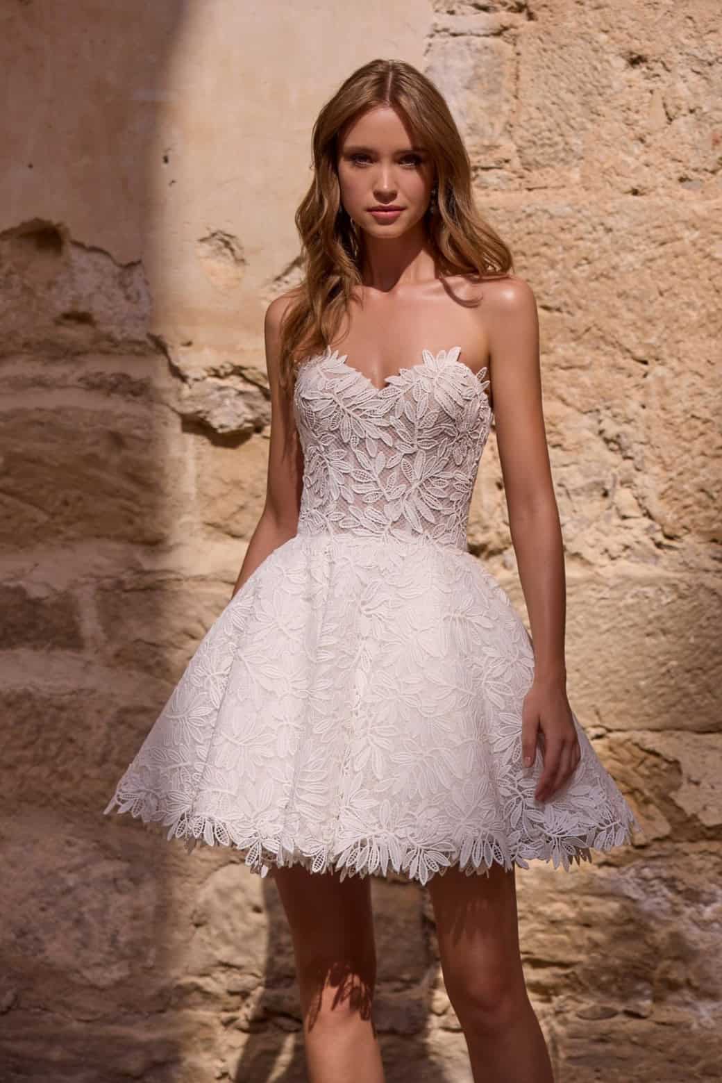 Ez a különleges esküvői ruha két eltérő megjelenést biztosít. Az alapruha egy rövid, pánt nélküli csipkeruha. Fiatalos, nőies és magabiztos hatást kelt. A szív alakú dekoltázs romantikus megjelenést ad. Szépen hangsúlyozza a felsőtestet és a dekoltázst.