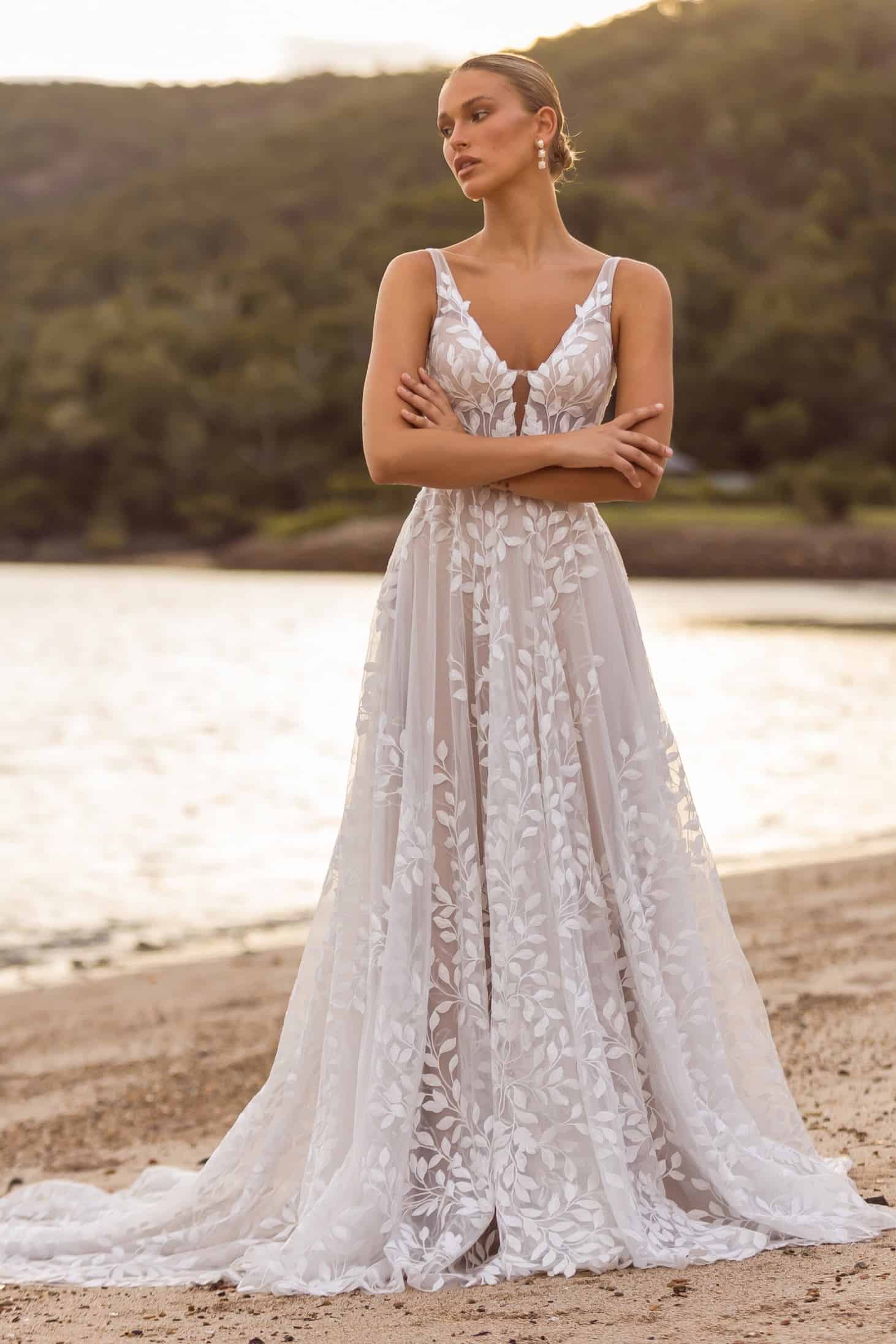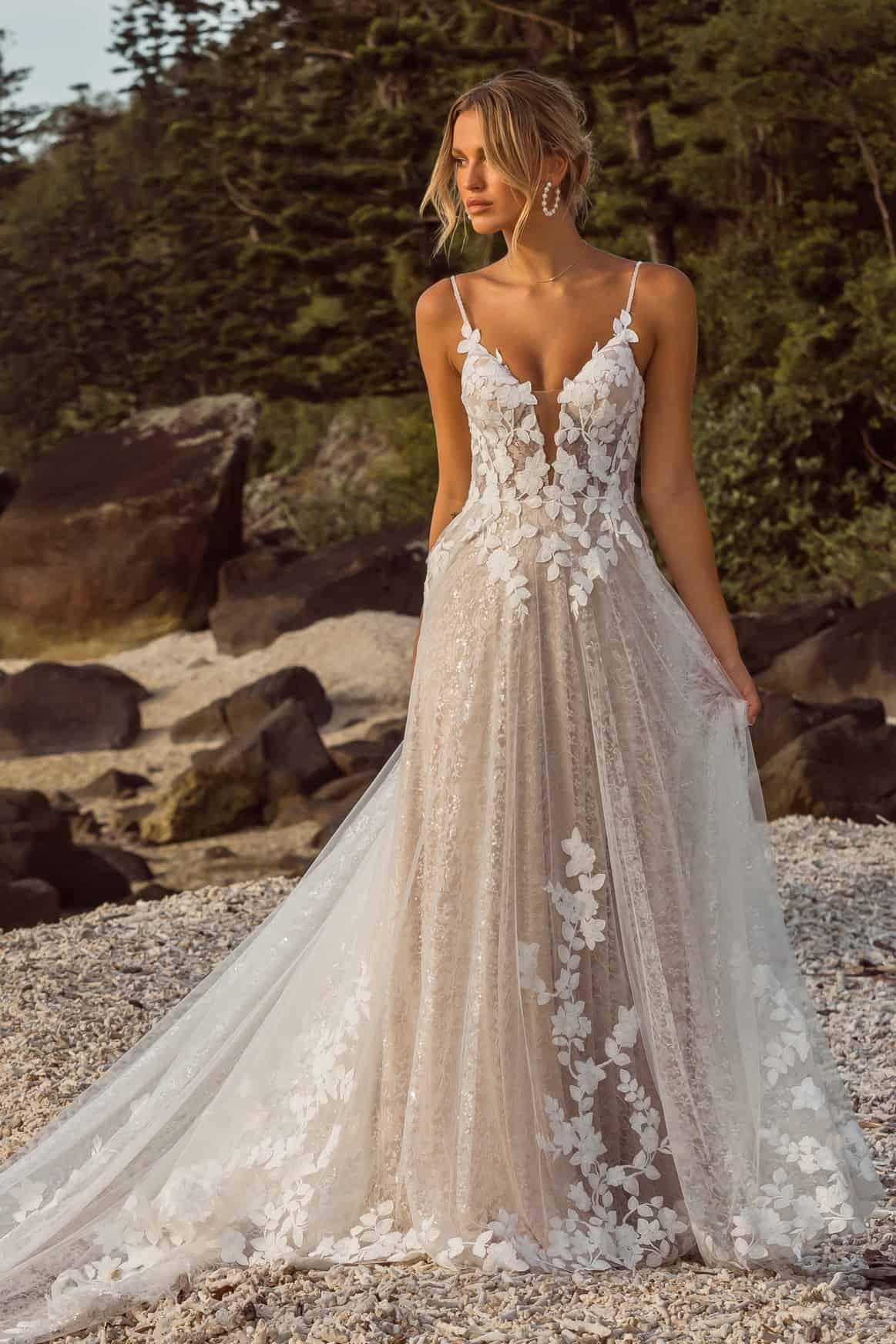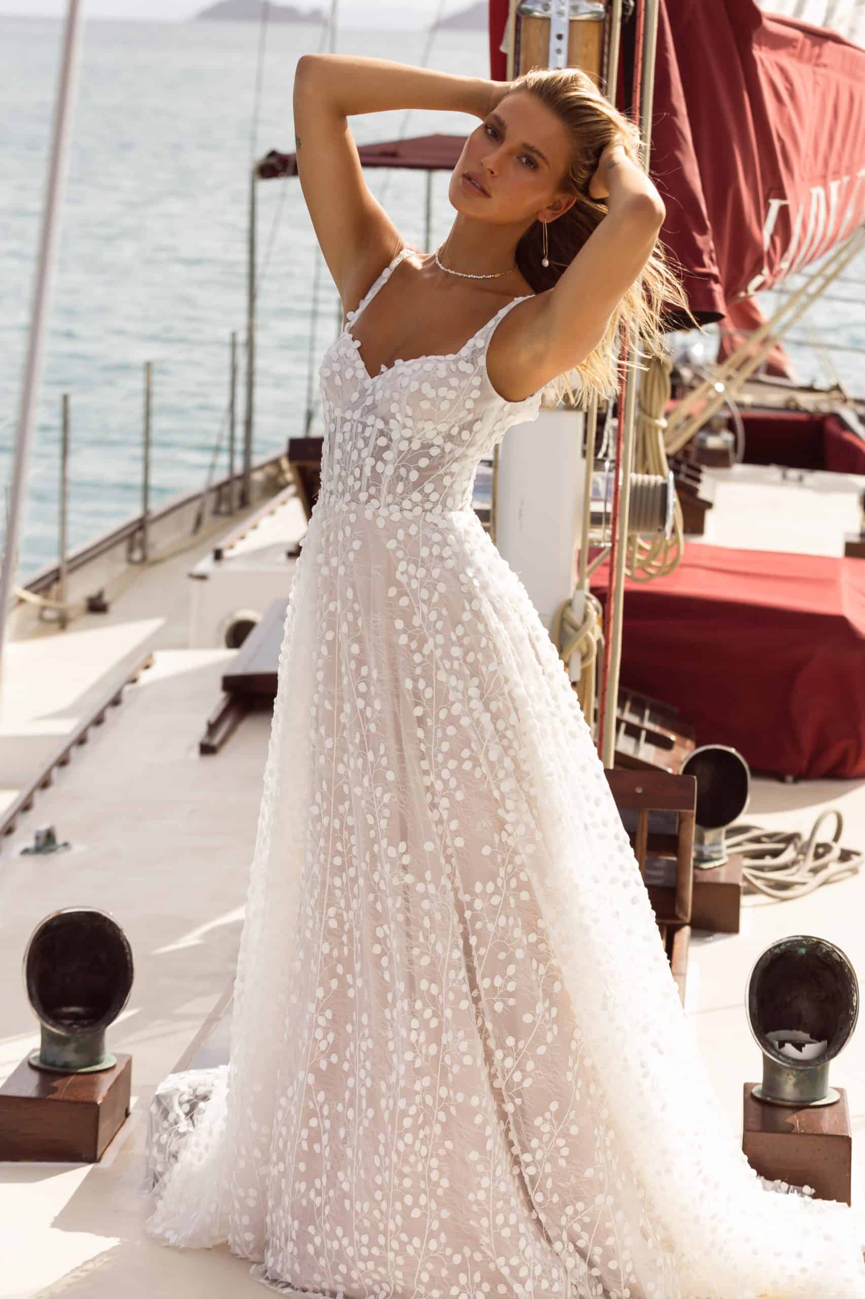 A Jazmin fantázianevű modell például nem igényel komoly frizurát, rakoncátlan, göndörödésre hajlamos, ad hoc, frissen mosott hajzuhataggal éppolyan szép, mint kiegyenesített hajjal vagy akár előre precízen kitalált konttyal. A titka, hogy kisebb és nagyobb esküvőkön is pazarul mutatsz benne, és tengerpartra éppoly megkapó, mint egy kastélyos ceremónián, amikor népes vendégsereg szeme láttára bontakoznál ki benne.