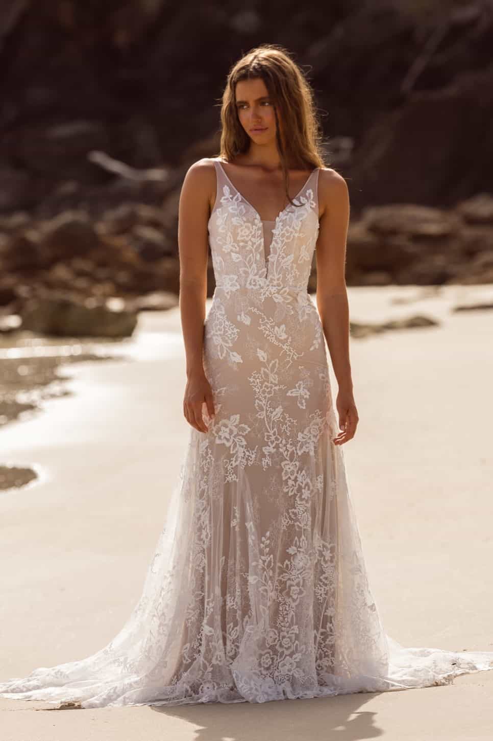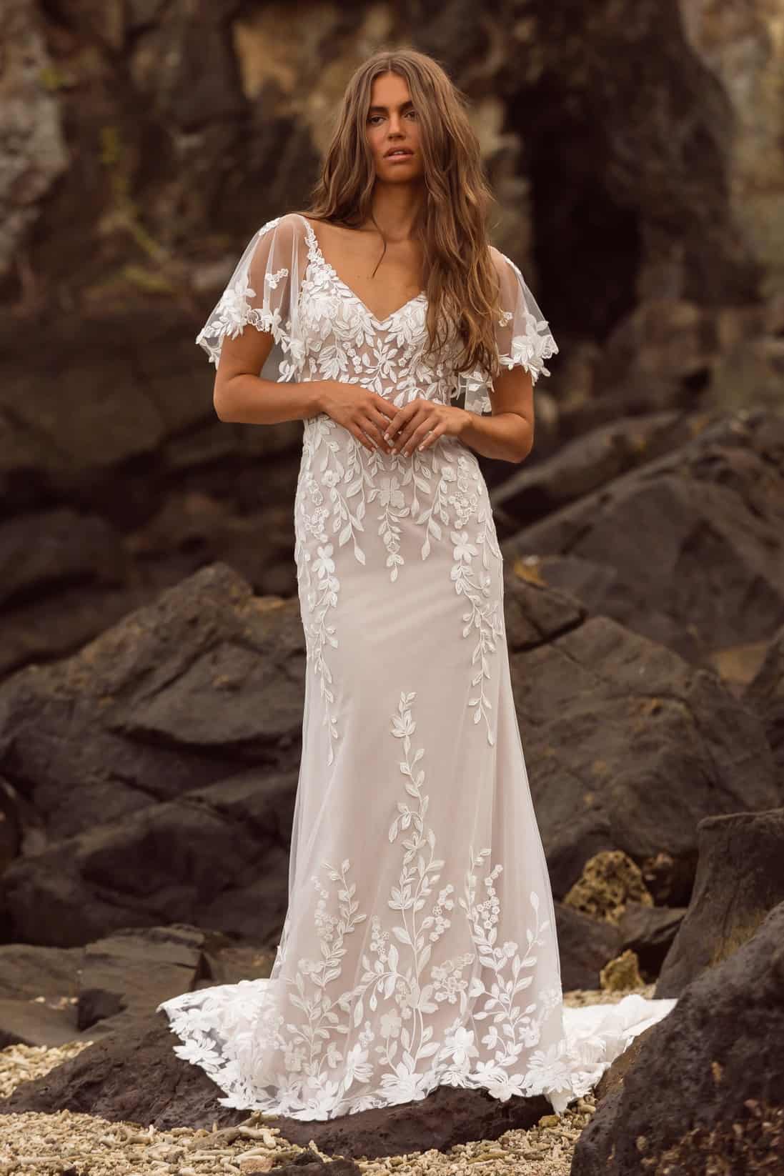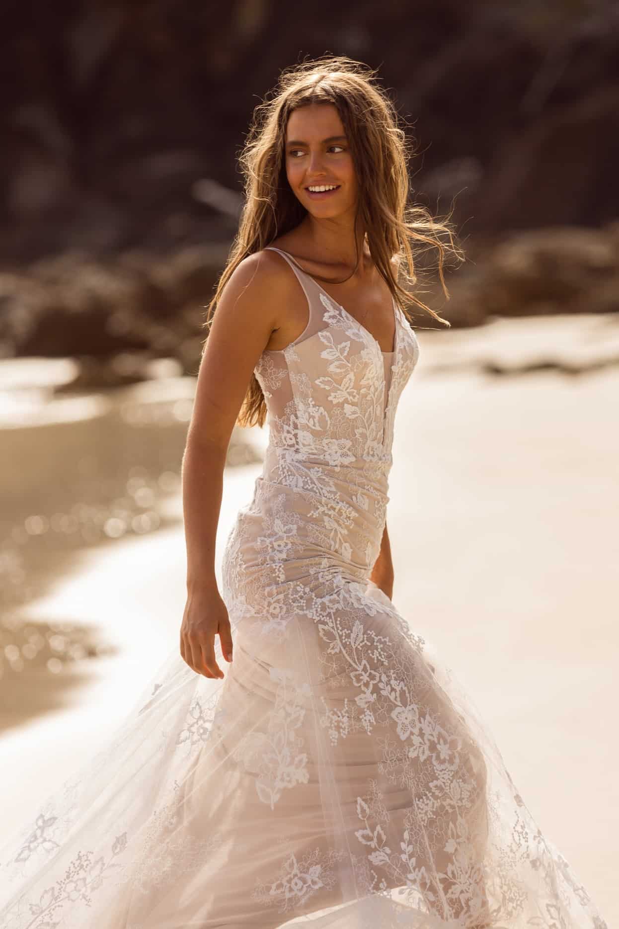 A Jazmin fantázianevű modell például nem igényel komoly frizurát, rakoncátlan, göndörödésre hajlamos, ad hoc, frissen mosott hajzuhataggal éppolyan szép, mint kiegyenesített hajjal vagy akár előre precízen kitalált konttyal. A titka, hogy kisebb és nagyobb esküvőkön is pazarul mutatsz benne, és tengerpartra éppoly megkapó, mint egy kastélyos ceremónián, amikor népes vendégsereg szeme láttára bontakoznál ki benne.