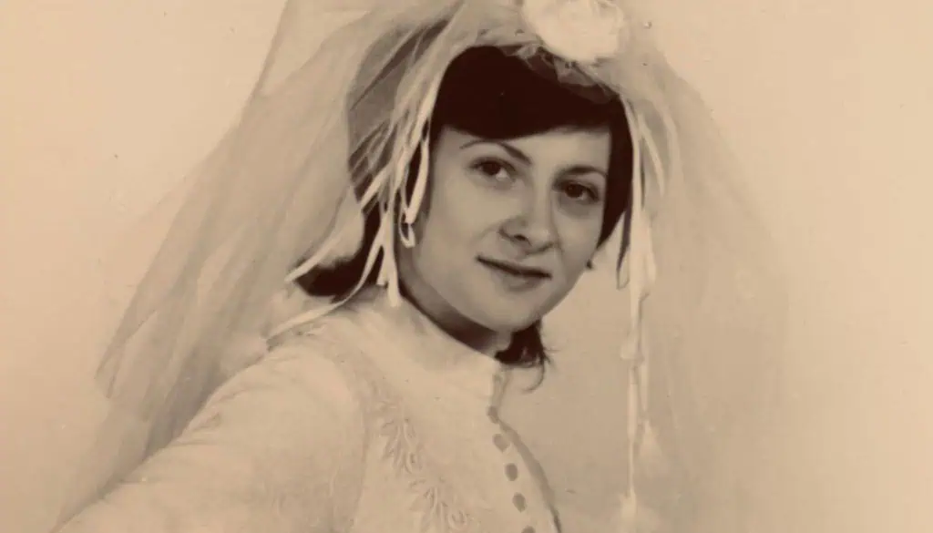 A szüleim esküvője 1972-ben volt. Anyukám ruhája brokát anyagból készült – igazi, tartást adó, fényes, ünnepi anyagból. A kabátka magasan záródott, a szűk szoknya térd fölött végződött, a fátylat egy rózsa díszítette, a megjelenést finom csipkekesztyű tette teljessé.