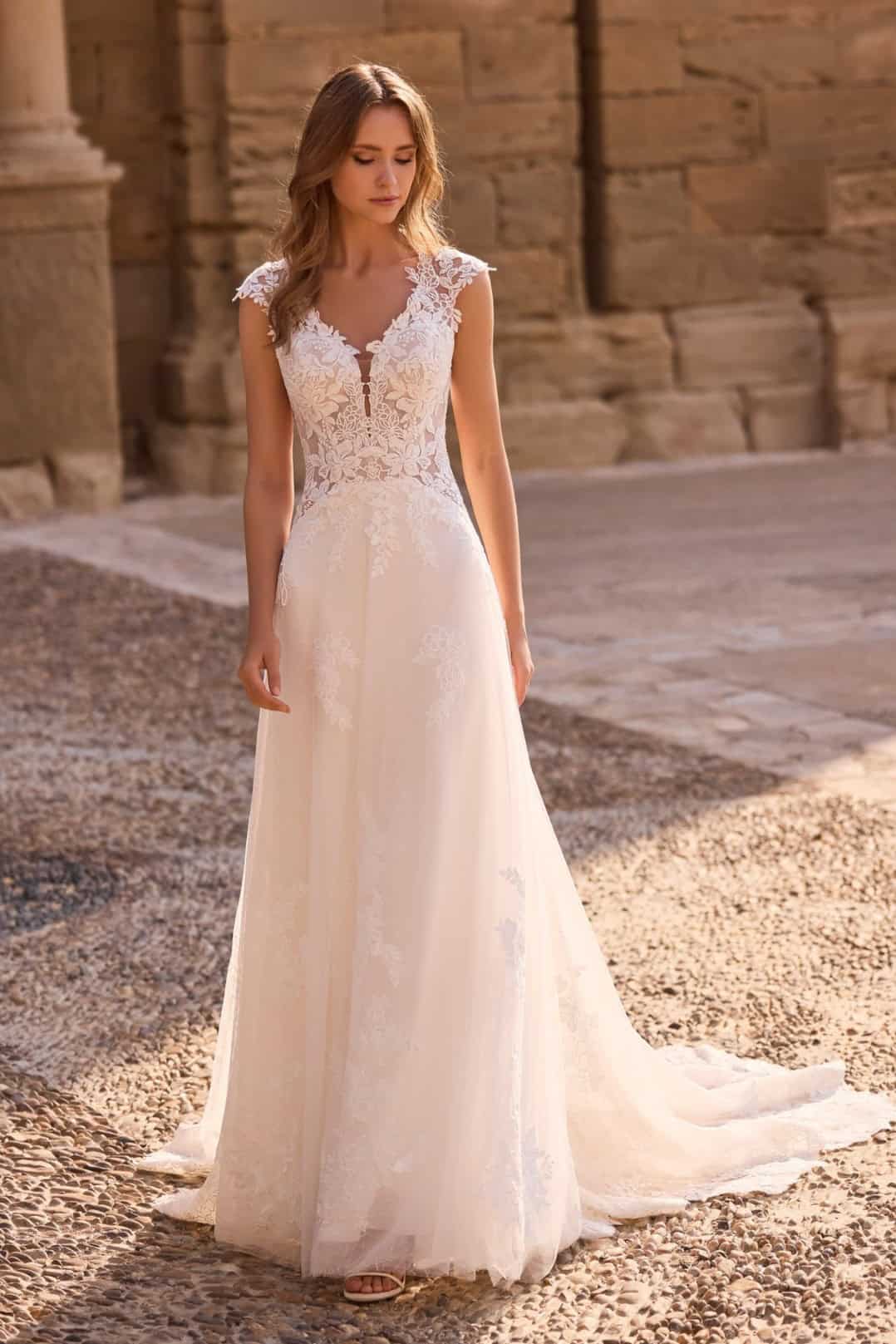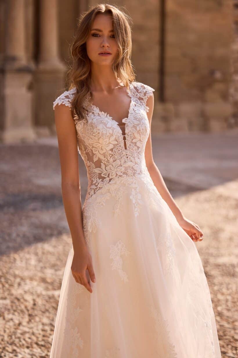 Az A-vonalú fazon előnyösen emeli ki a felsőtestet, miközben a könnyed tüllszoknya lágy esésével elegánsan követi a mozdulatokat. Ez a kialakítás az A-vonalú csipkés menyasszonyi ruha egyik legnagyobb előnye, hiszen kiegyensúlyozott arányokat teremt, és kényelmes viseletet biztosít egész nap.