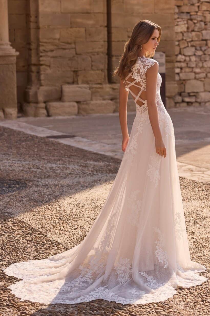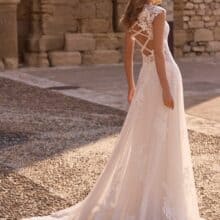 A hátoldalon megjelenő finom tüllszalag légies, modern hangsúlyt ad a modellnek. Ez a részlet játékosan egészíti ki az A-vonalú csipkés menyasszonyi ruha klasszikus vonalvezetését, miközben megőrzi annak elegáns karakterét.