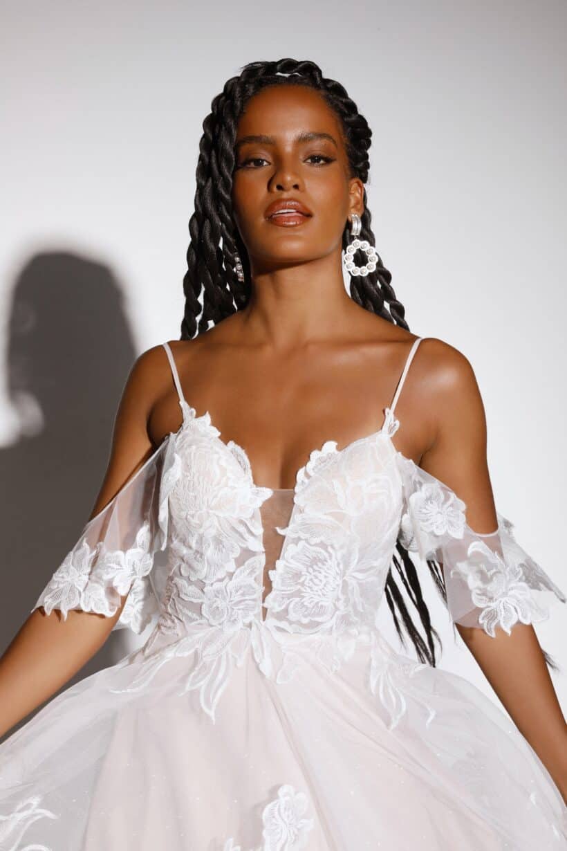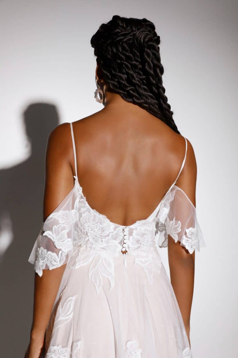 A szoknyát hímzett csipke, finom flitterek és egy különleges glitter tüll réteg teszi igazán látványossá. Ezek a részletek visszafogott csillogást adnak a ruhának, amely nappali fényben és esti megvilágításban is gyönyörűen érvényesül. A tüllszoknyás menyasszonyi ruha romantikus karaktere tökéletesen illeszkedik a modern menyasszony stílusához.