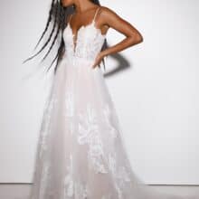 Az A-vonalú menyasszonyi ruha spagettipánttal kifinomult választás azoknak a menyasszonyoknak, akik könnyed eleganciára, romantikus részletekre és modern megjelenésre vágynak. A Presley modell légies mozgásával és finoman csillogó anyagaival minden pillanatban különleges hatást kelt.