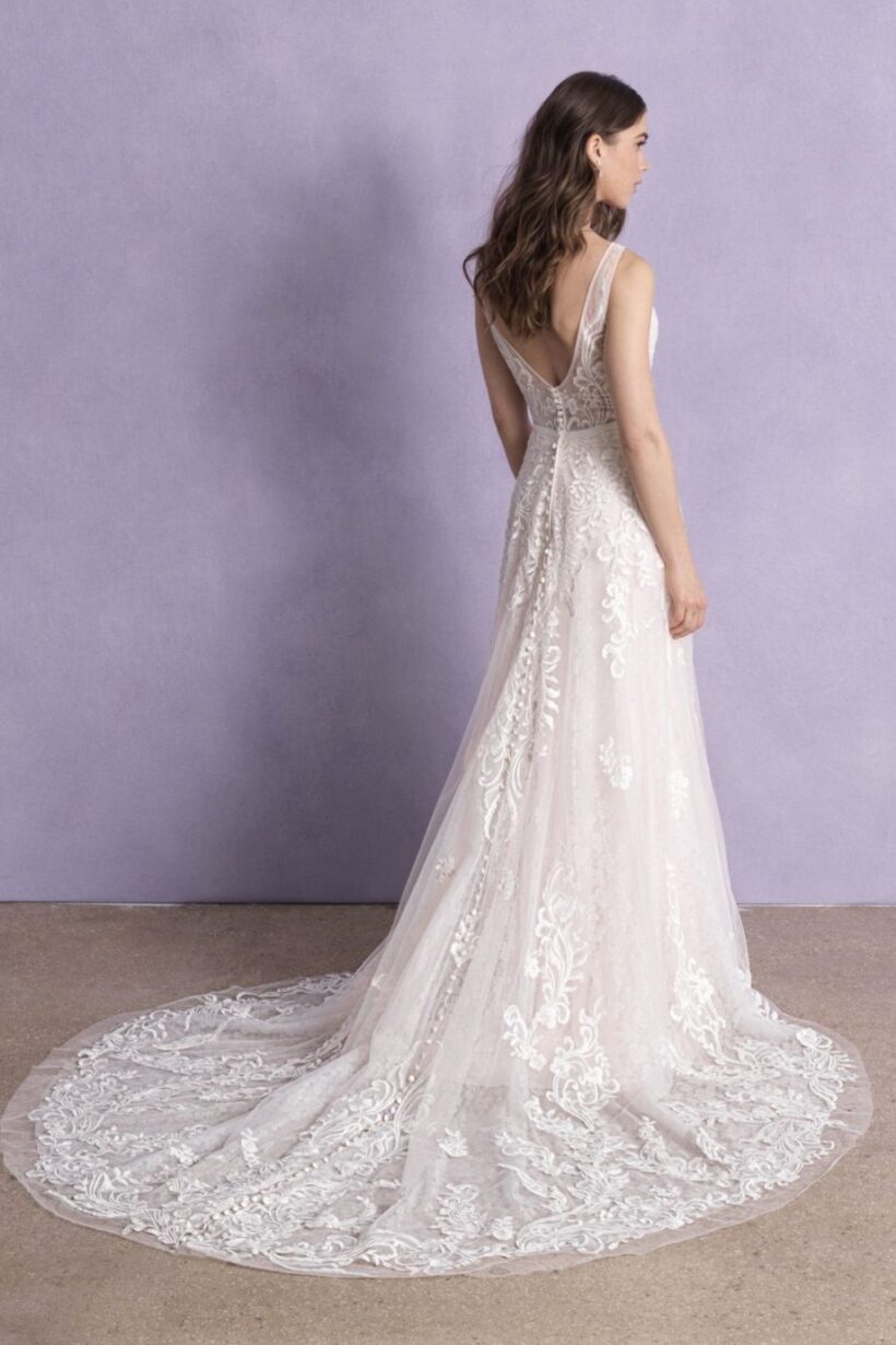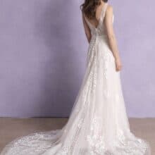 Az Allure Bridals 3355 menyasszonyi ruha a letisztult elegancia és a modern stílus harmonikus kombinációja, amely most kiárusítás keretén belül érhető el. A kis A-vonalú szabás finom sziluettet ad. A lágy esésű tüll könnyed hatást biztosít. A csipkedíszítés visszafogott, mégis különleges megjelenést nyújt.