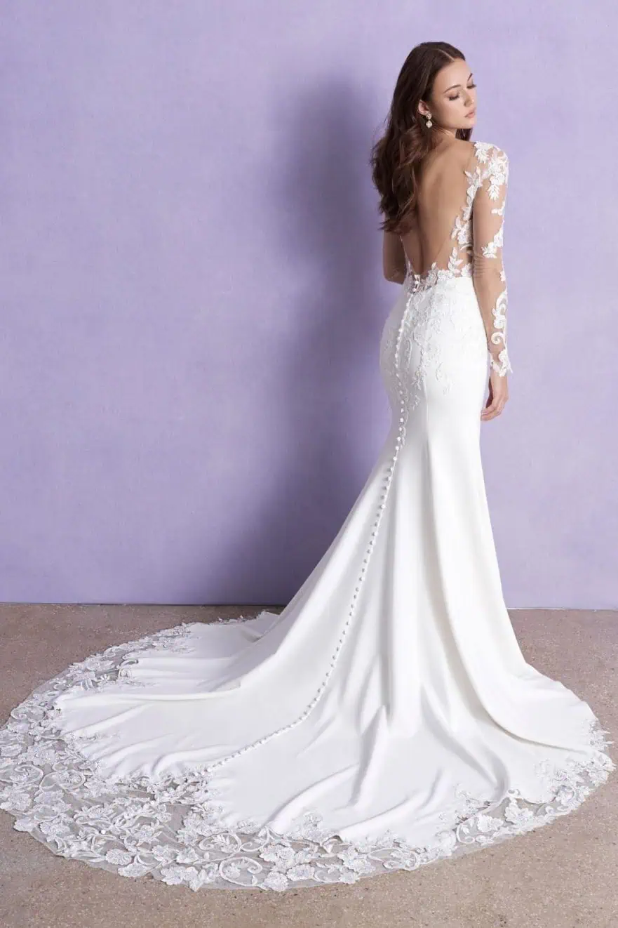 Az Allure Bridals 3359 egy lenyűgöző sellő fazonú esküvői ruha, amely a klasszikus eleganciát és a modern nőiességet ötvözi. Az alakot kiemelő zsorzsett anyag lágyan követi a vonalakat, miközben a hosszú, áttört csipke ujjak romantikus és kifinomult hatást keltenek.