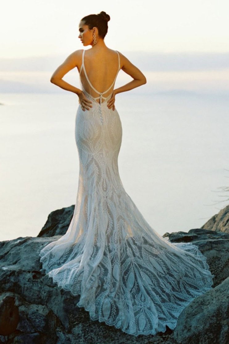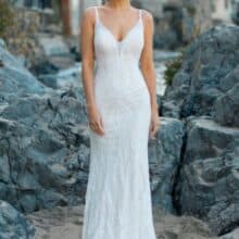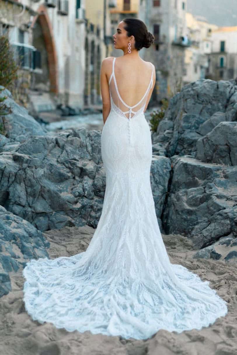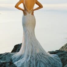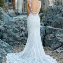 A mély hátkivágás látványos részlet. A hosszú uszály drámai hatást kelt. Az Allure Bridals F211 Finley ideális választás, ha természetes, elegáns és modern stílusú ruhát keresel. Felpróbálható az Eklektika Esküvői Ruhaszalon szalonban.