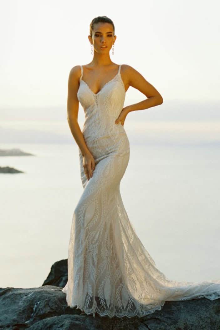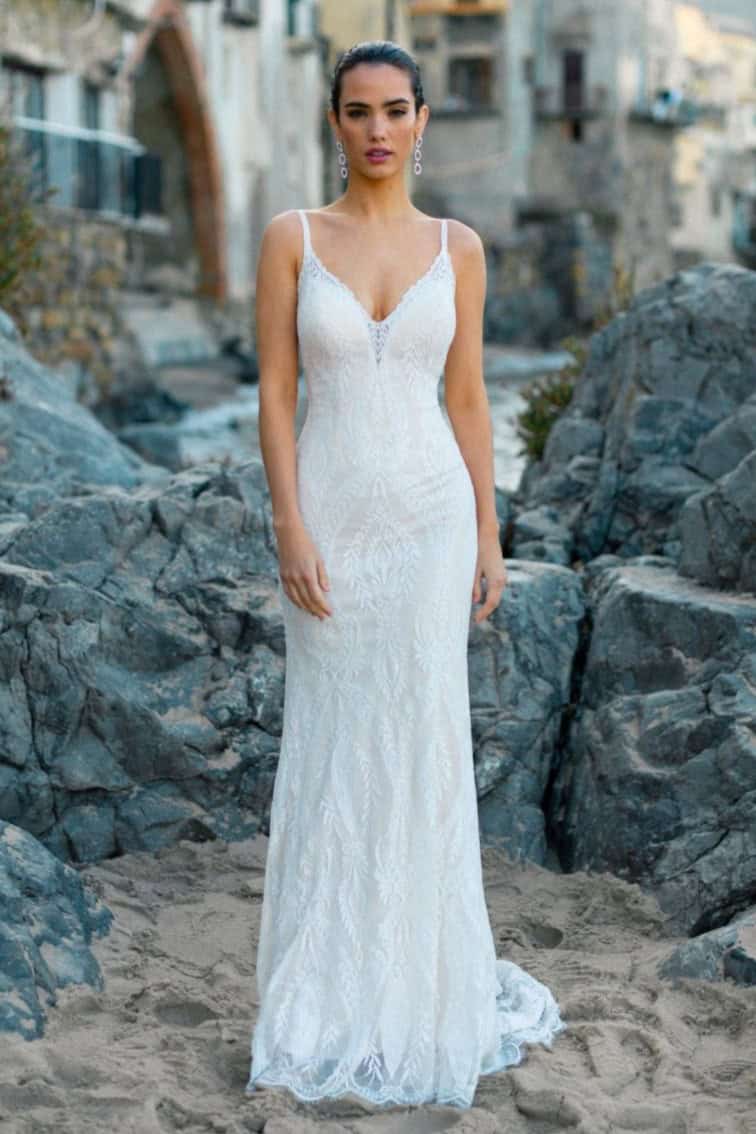 Az Allure Bridals F211 Finley menyasszonyi ruha letisztult eleganciát kínál, és most kiárusítás keretén belül érhető el. A Chantilly csipke finom textúrát ad. A spagetti pántok könnyed és nőies megjelenést biztosítanak. Az egyenes szabás kényelmes viselet egész napra.