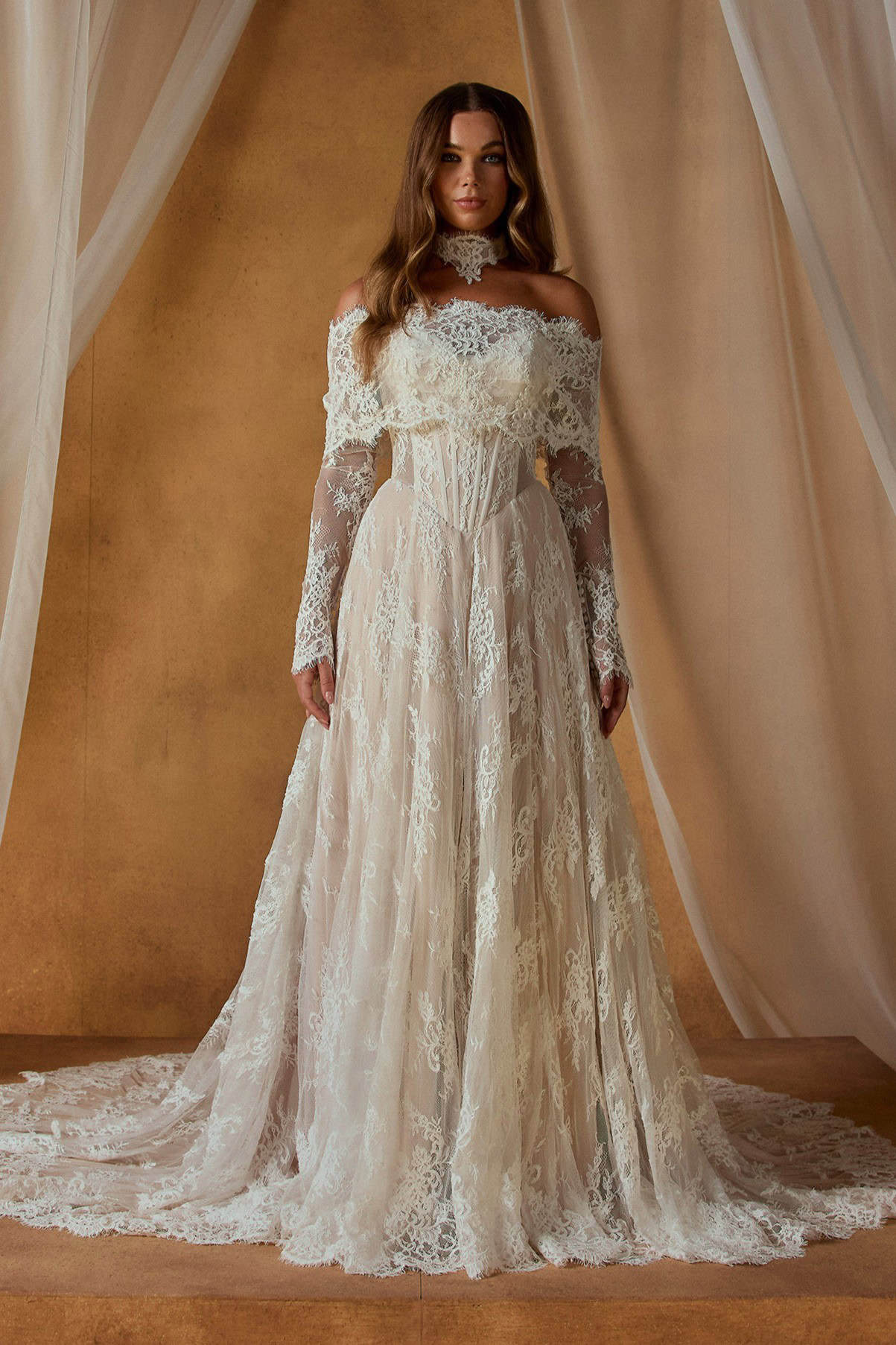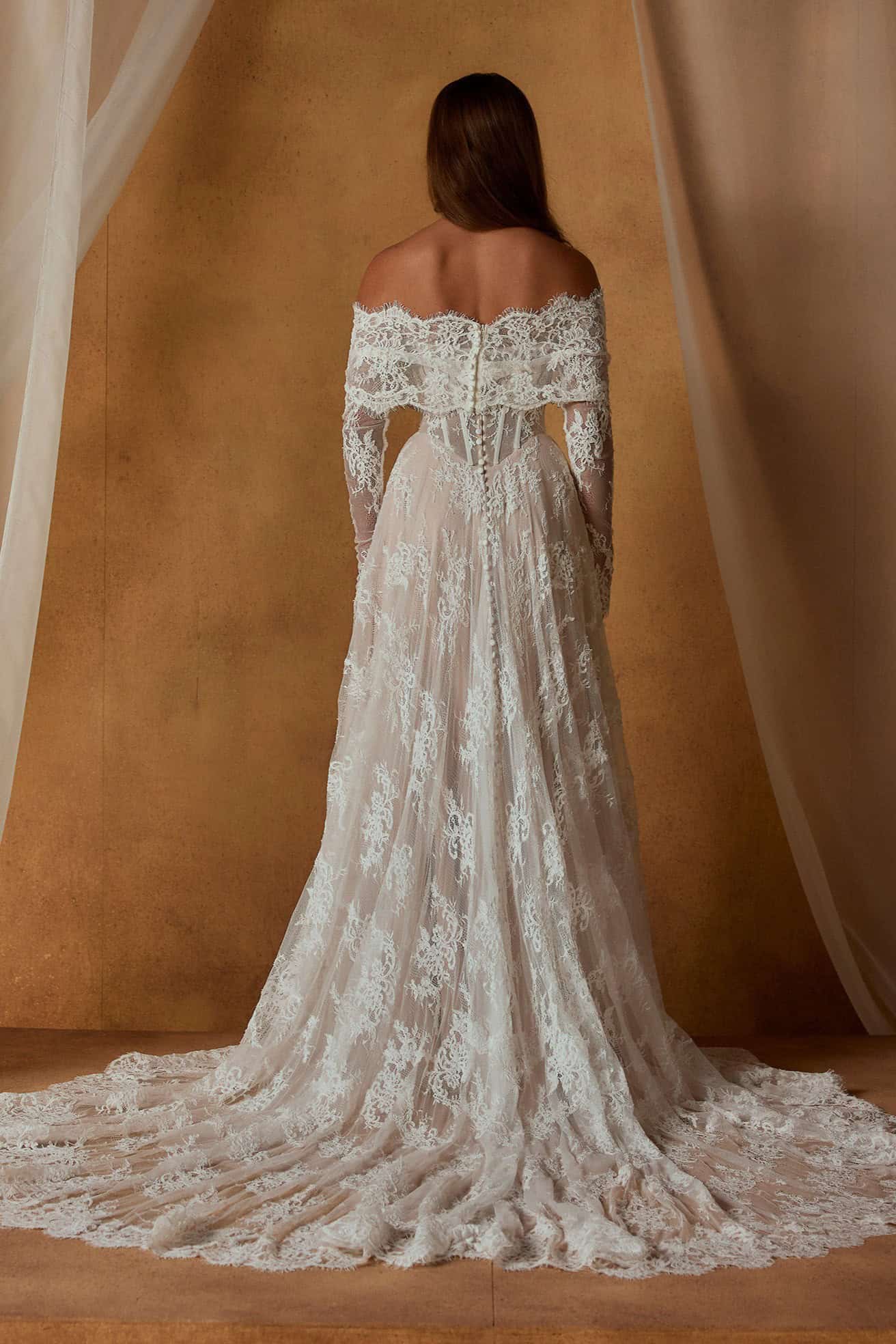 A Nivaya modellhez tartozó lecsatolható csipke kabát vállra húzott fazonban készült. Az illúzió ujjak és az elegáns „eyelash” csipkeszegély különleges ceremónia megjelenést adnak. A harmonizáló csipkegallér couture ihletésű részlet, amely tovább erősíti a ruha romantikus karakterét.