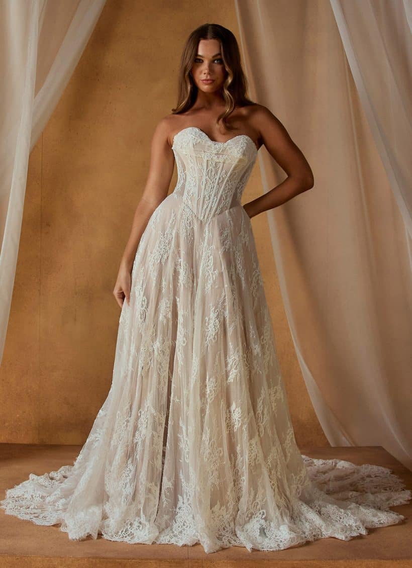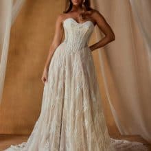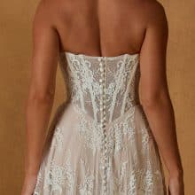A pánt nélküli, szív alakú dekoltázs illúzió felsőrésszel és látható fűzőmerevítéssel készül. Ez a kialakítás stabil tartást biztosít, miközben gyönyörűen formálja az alakot. A zsinórozott csipkemotívumok finoman követik a test vonalát, romantikus textúrát adva a ruhának.