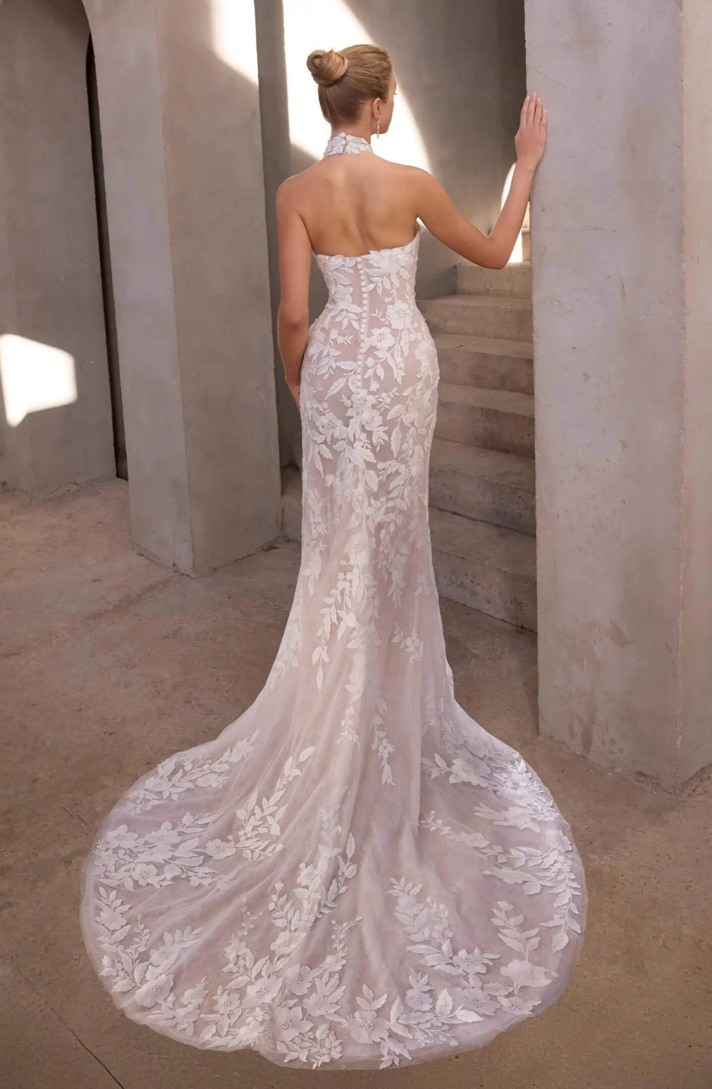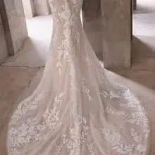A „Kali” menyasszonyi ruha olyan, mint egy vers a mozgásban – könnyed, romantikus és kifinomult. A tüllből készült egyenes szabású ruha szinte lebeg a testen, miközben a virágos hímzések és 3D applikációk élettel töltik meg a teljes sziluettet. A nyakpántos felsőrész finoman keretezi a vállakat és nyakat, rendkívül elegáns és modern hatást keltve.