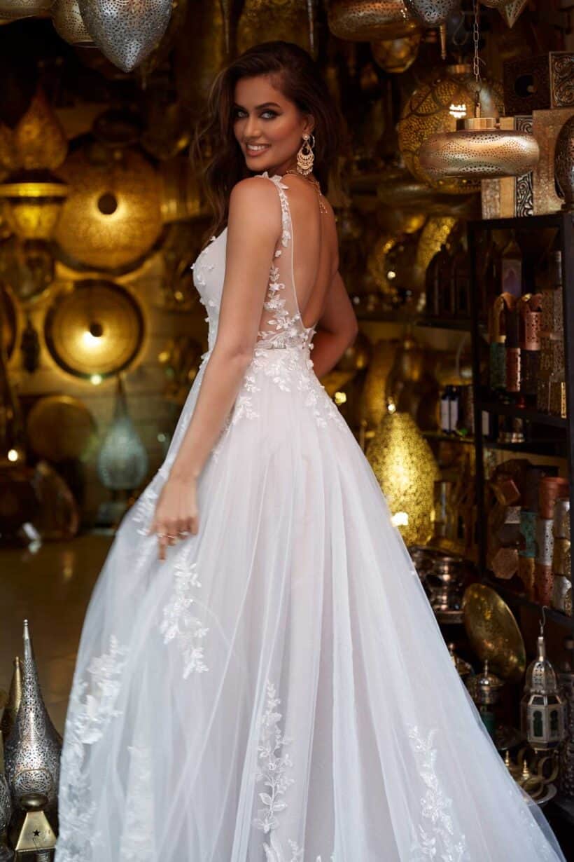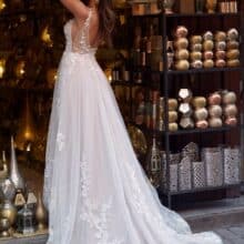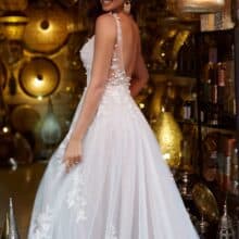 A rétegzett, puha tüllszoknya könnyed mozgást ad a ruhának. Bevonuláskor és a táncparketten is légies hatást kelt, miközben megőrzi a hercegnős romantikát. A finoman ívelt, áttetsző hátrész újabb különleges részletként jelenik meg, amely tökéletesen kiegészíti a ruha összhatását.