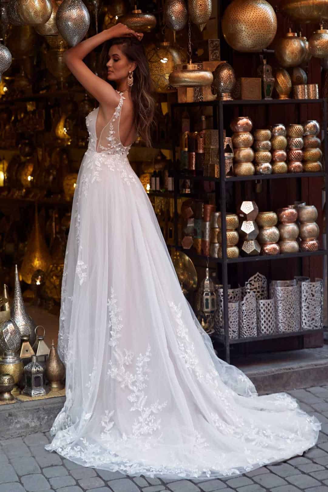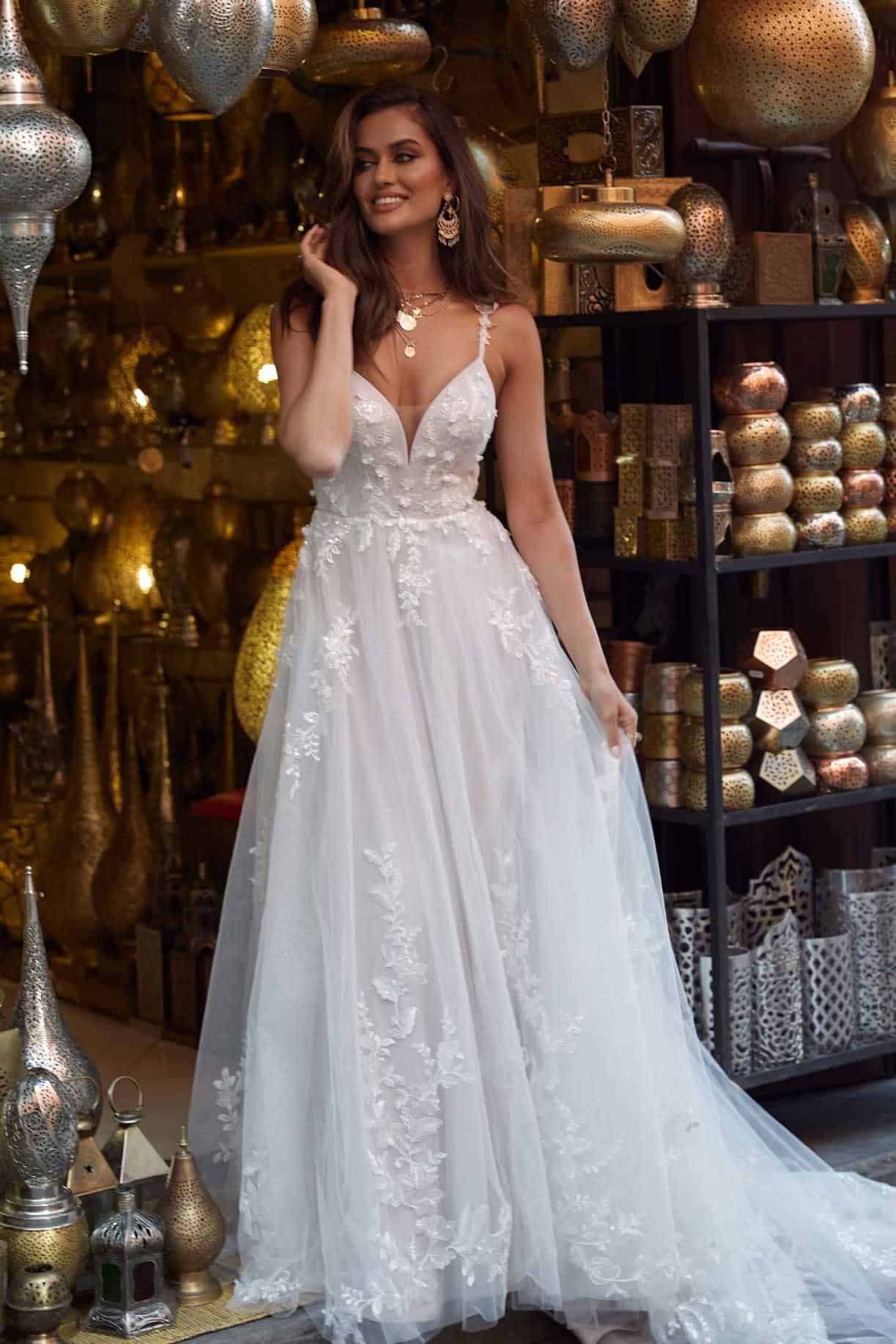 Az Aria különlegessége, hogy nappali és esti fényben egyaránt ragyog. A finom flitterek gyengéd csillogása naplementében és gyertyafényben is érvényesül, varázslatos hangulatot teremtve. Ez a 3D csipkés menyasszonyi ruha ideális választás szabadtéri esküvőkhöz, romantikus kastélyokba vagy tengerparti ceremóniákra, ahol a természetes környezet és a ruha légies szépsége tökéletes harmóniában találkozik.