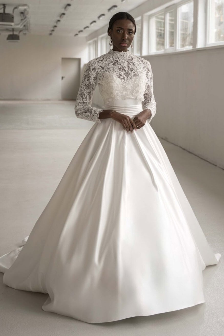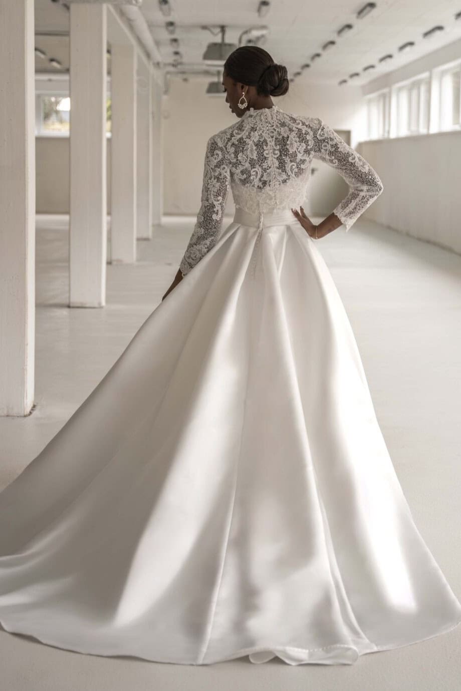 A Diane Legrand 1905 menyasszonyi ruha időtlen és kifinomult megjelenést biztosít. A mikádó anyag elegáns tartást ad. A szív alakú dekoltázs romantikus hangsúlyt teremt. A deréknál szűkített szabás kiemeli az alakot. A grandiózus szoknya látványos esést ad. A levehető csipke felsőrész kétféle stílust biztosít. A magas nyak és hosszú ujjak klasszikus hatást adnak. A hosszú uszály drámai megjelenést teremt.