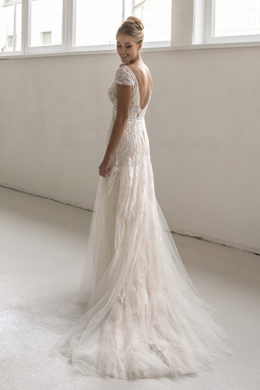 A V-kivágás kiemeli a nyakat és a vállakat. A mély hátkivágás nőies megjelenést biztosít. A rövid ujjak finom eleganciát adnak. A könnyed tüll szoknya légies mozgást biztosít. A Diane Legrand 2517 ideális választás, ha időtlen és romantikus ruhát keresel. Felpróbálható az Eklektika Esküvői Ruhaszalon szalonban.