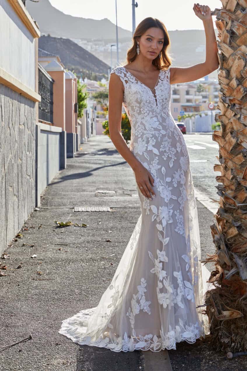 A Diane Legrand 7914 menyasszonyi ruha kifinomult és modern megjelenést ad. Az egyenes szabás finoman követi az alakot. Kiemeli a nőies vonalakat. A csipke romantikus részleteket teremt. A tüll könnyed esést biztosít. A V-kivágás elegáns hangsúlyt ad. A magas hátrész letisztult hatású. Az illúziócsipke sejtelmes részletet ad.