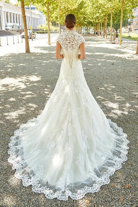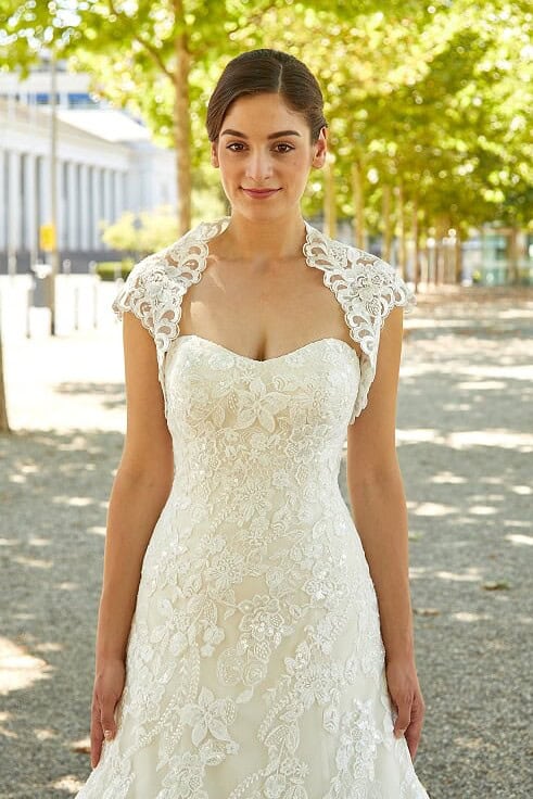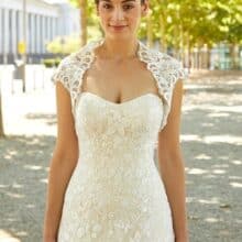 A szív alakú kivágás romantikus karaktert ad. A hozzá tartozó boleró finoman takarja a vállakat. A csipkedíszítés időtlen eleganciát sugároz. A Diane Legrand N30333 ideális választás, ha kényelmes és kifinomult menyasszonyi ruhát keresel. Felpróbálható az Eklektika Esküvői Ruhaszalon szalonban.