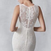 Elöl és hátul is zárt kialakítás jellemzi. A szív alakú dekoltázst áttetsző csipke fedi. Ez finoman keretezi a vállakat és a hátat. Az ujjatlan fazon könnyed megjelenést biztosít. Ideális választás, ha klasszikus, mégis különleges stílust keresel.