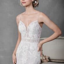 A spagetti pántok légies megjelenést adnak. Az apró gyöngy díszítések finom csillogást biztosítanak. A ruha részletgazdag, mégis harmonikus összhatást kelt. Ideális választás, ha klasszikus csipkét keresel modern szabással.