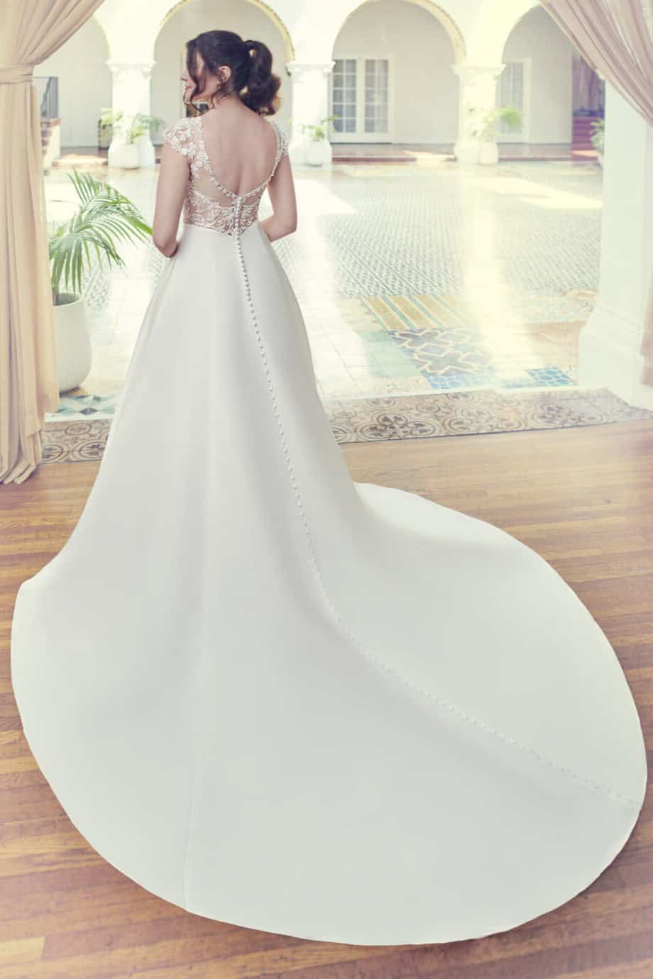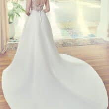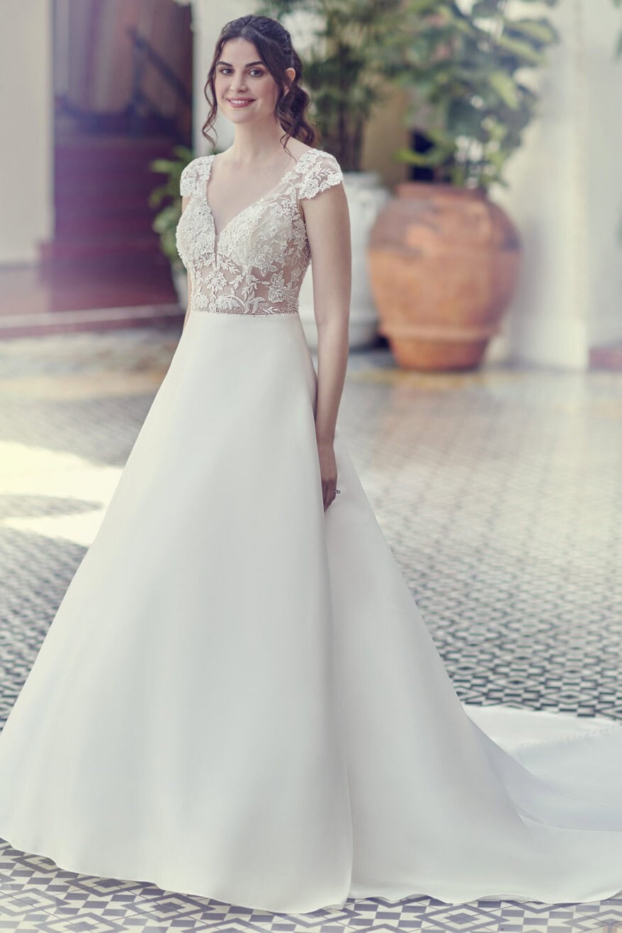 Az A-vonalú szabás kiemeli a derekat és szép sziluettet formál. A vállcsúcsig érő V-nyakkivágás nőies karaktert ad. Az Ella Rosa BE578 ideális választás, ha modern, mégis klasszikus menyasszonyi ruhát keresel. Felpróbálható az Eklektika Esküvői Ruhaszalon szalonban.