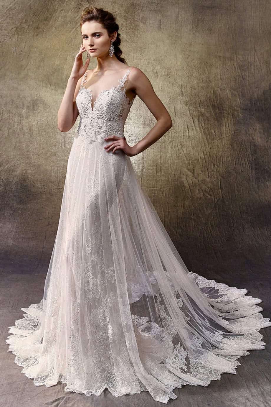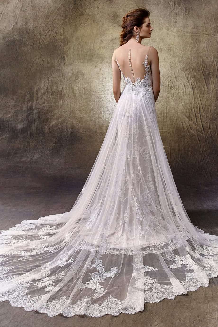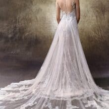 Az Enzoani Lovely menyasszonyi ruha látványos és elegáns megjelenést biztosít. A sellő szabás kiemeli az alakot. A tüll rátét dús hatást ad. A csipkeuszály romantikus részletet teremt. A tüll és csipke kombináció könnyed mozgást biztosít. A sziluett egyszerre nőies és drámai.