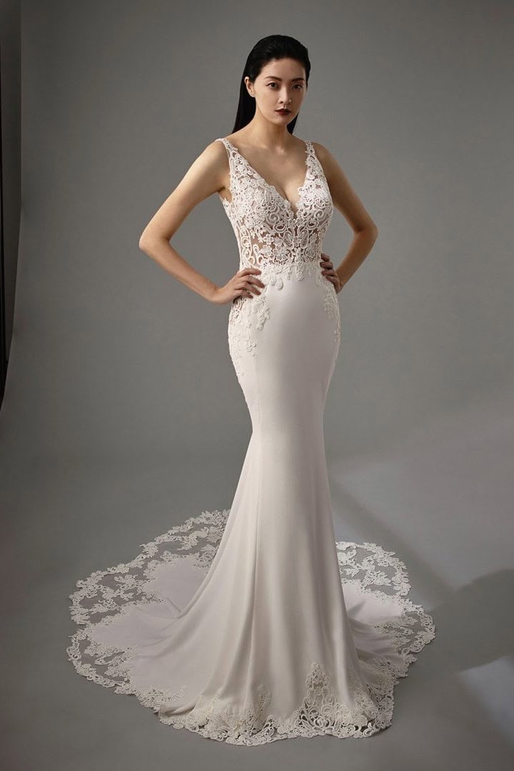 Az Enzoani Mimi menyasszonyi ruha klasszikus és modern megjelenést kínál. A sellő szabás finoman követi az alakot. Kiemeli a nőies vonalakat. A csipke és zsorzsett kombináció luxus hatást ad. A mély V-hátkivágás elegáns hangsúlyt teremt. A borított gombok végigfutnak a hátvonalon. A tüll és csipke uszály légies mozgást biztosít.