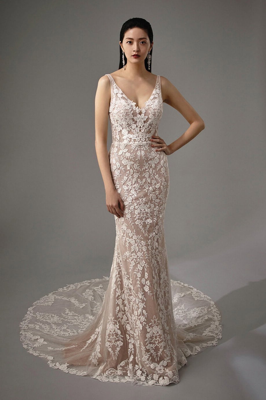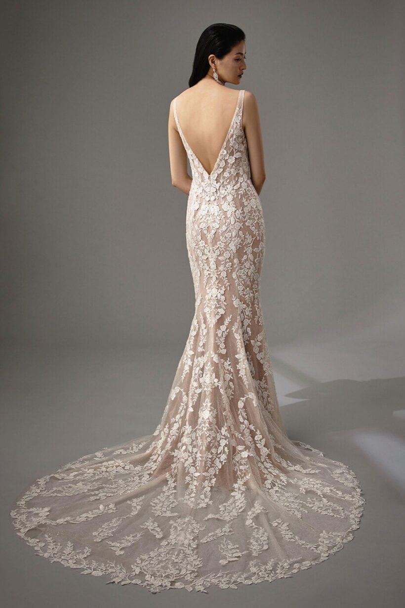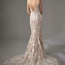 Az Enzoani Mirinda menyasszonyi ruha elegáns és nőies megjelenést biztosít. A sellő szabás finoman követi az alakot. Kiemeli a derekat és a csípőt. A V-kivágás formálja a dekoltázst. A pamutcsipke romantikus textúrát ad. A csipkeréteg alatt rejtőző csillogó tüll finoman ragyog. A tüllrétegek lágyan bővülnek a szoknyán.