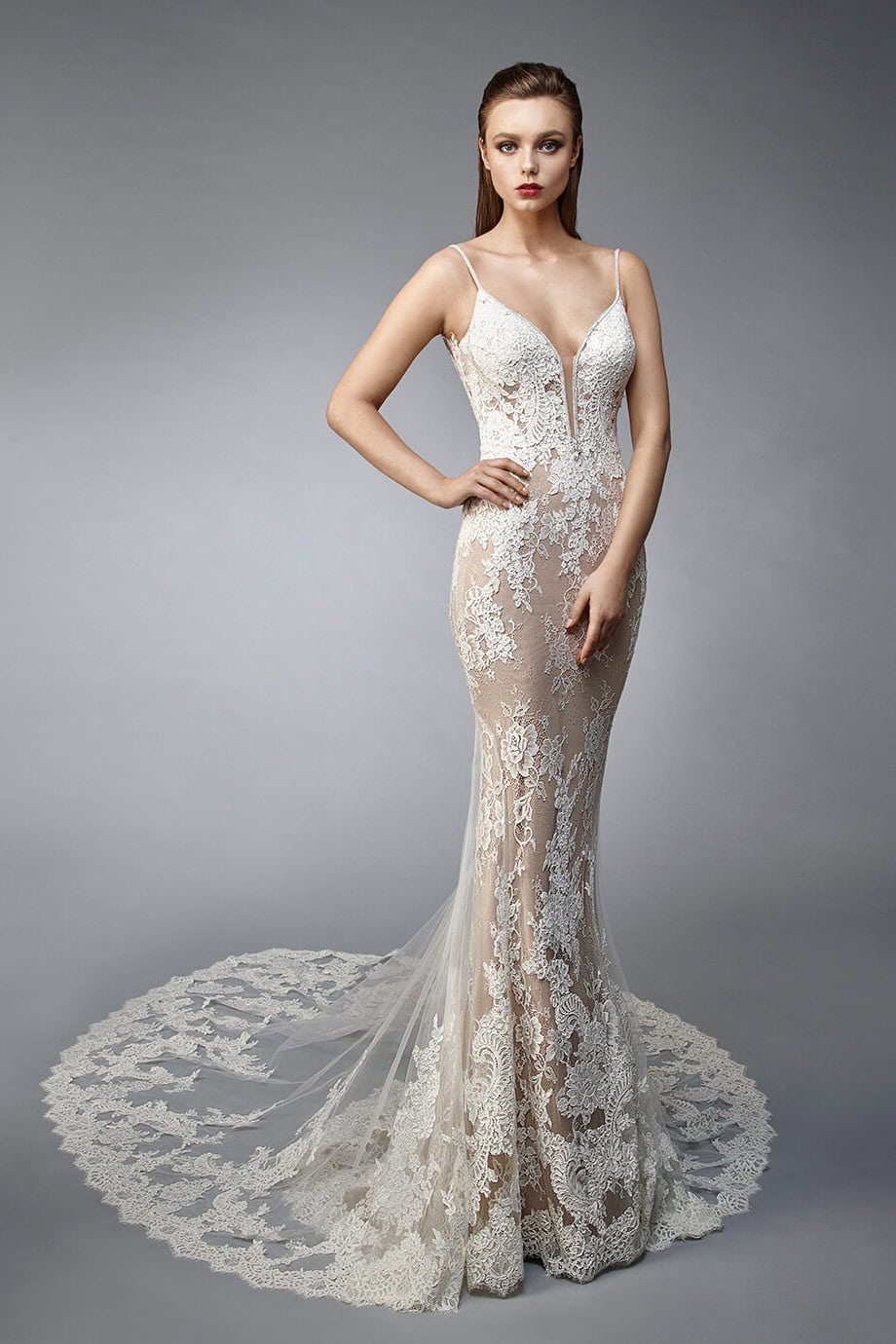Az Enzoani Neve menyasszonyi ruha kifinomult és nőies megjelenést biztosít. A sellő szabás finoman követi az alakot. Kiemeli a derekat és a csípőt. A spagetti pántok könnyed tartást adnak. A csipkefelsőrész romantikus hatást kelt. A mély hátkivágás érzéki hangsúlyt teremt. A csipke uszály elegánsan lebeg. A tüllrétegek lágy mozgást biztosítanak.