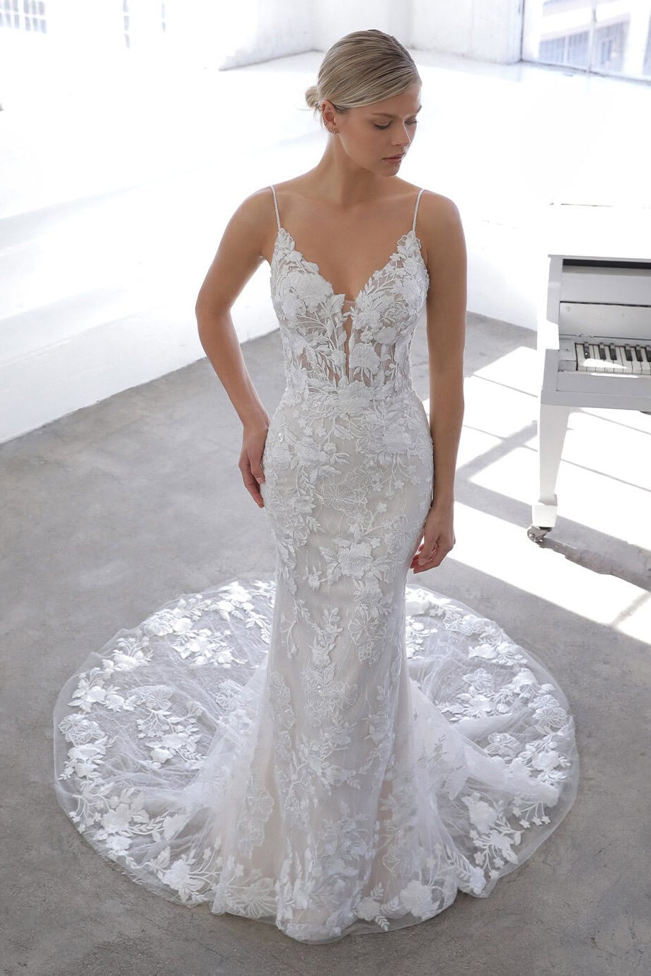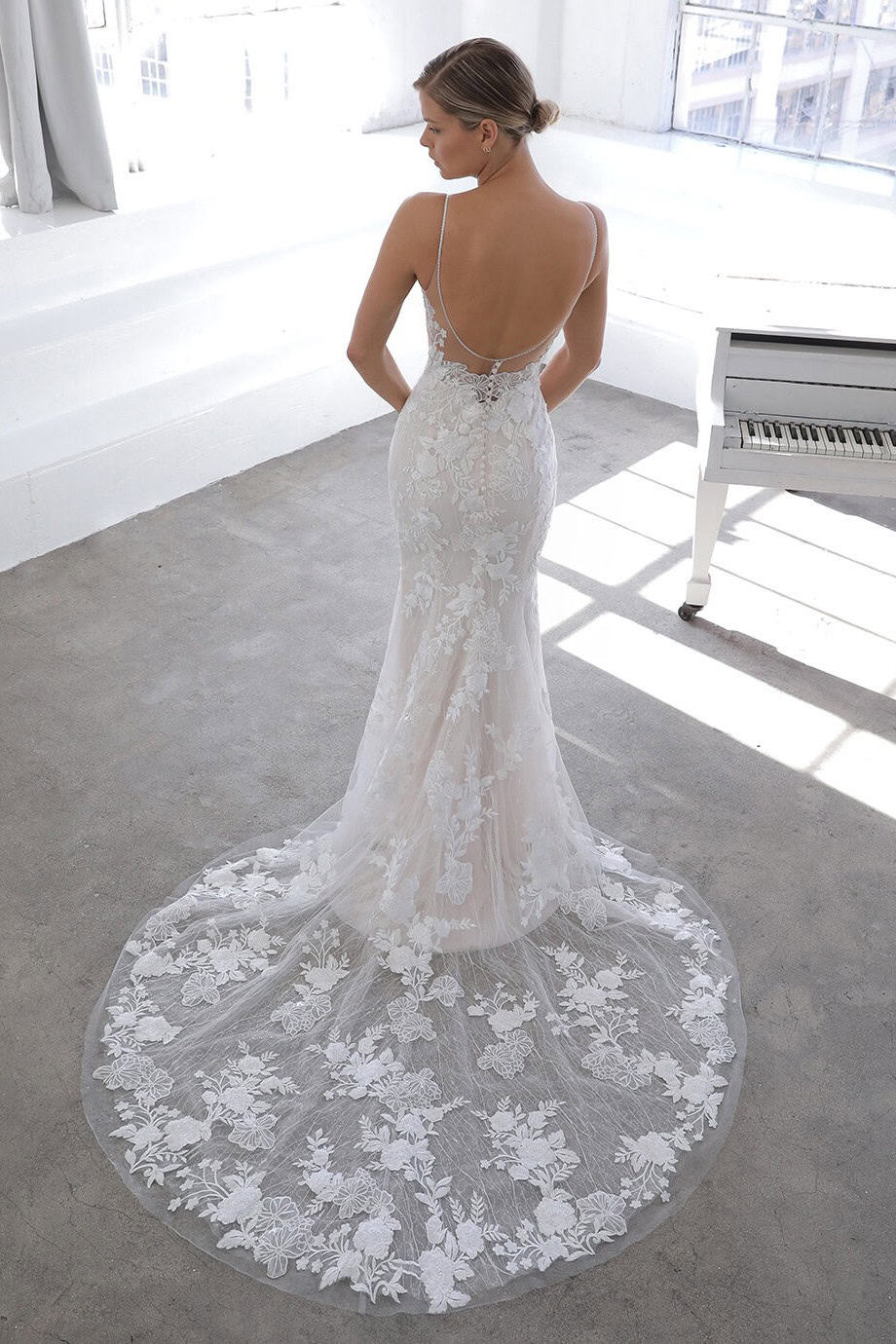 Az Enzoani Nicolina menyasszonyi ruha romantikus és luxus megjelenést biztosít. A sellő szabás finoman követi az alakot. Kiemeli a derekat és a csípőt. A virágmintás csipke elegáns textúrát ad. A csipke alatt rejtőző csillogó tüll sejtelmes fényt ad. A szoknya alján tüllrétegekben bővülő fazon drámai hatást kelt.