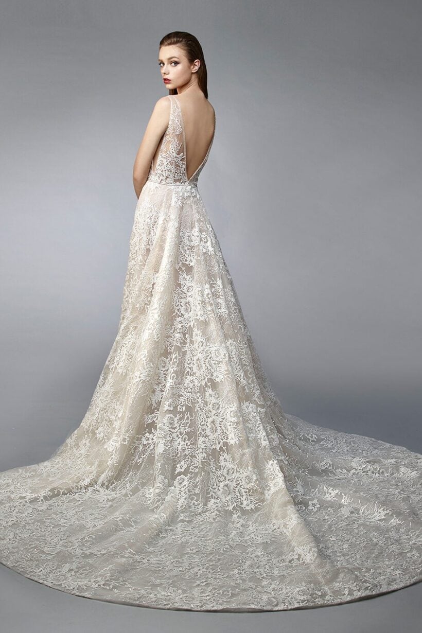 A légies A-vonalú szabás könnyed mozgást biztosít. A csipkés uszály elegáns és drámai hatást kelt. Az Enzoani Nirvana tökéletes választás, ha modern, érzéki és kifinomult menyasszonyi ruhát keresel. Felpróbálható az Eklektika Esküvői Ruhaszalon szalonban.