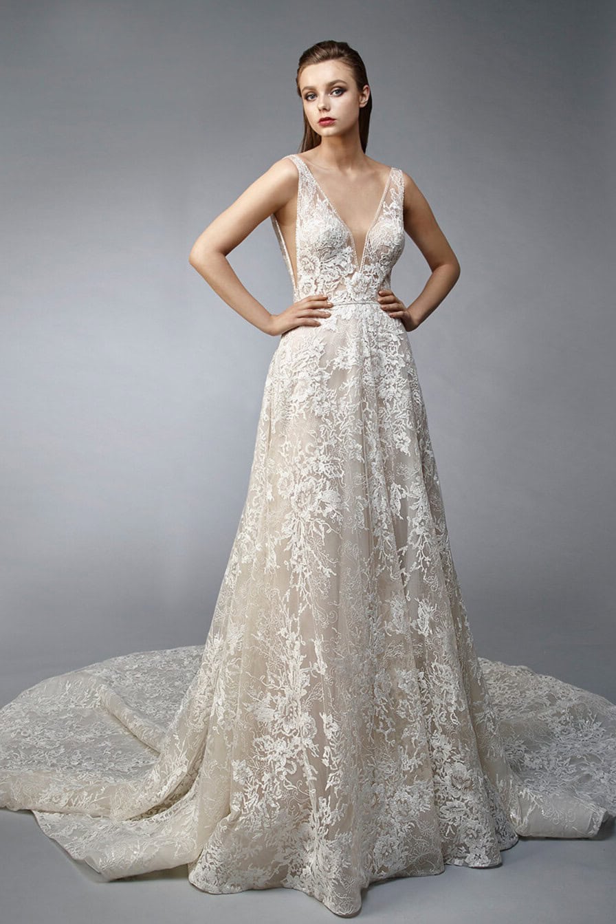Az Enzoani Nirvana – Szexi A-vonalú esküvői ruha mély dekoltázzsal a Enzoani kollekció különleges modellje, amely most kiárusítás keretén belül érhető el. Az elöl és hátul mély dekoltázs látványos megjelenést ad. Az áttetsző tüll betétek finoman hangsúlyozzák a nőies vonalakat. A vékony, csillogó öv kiemeli a derekat.