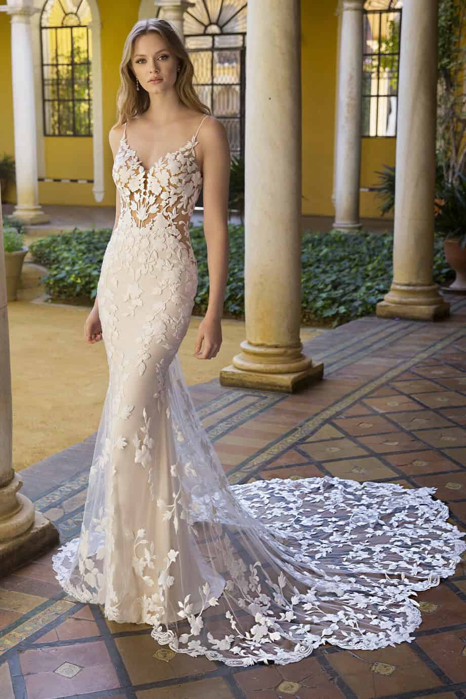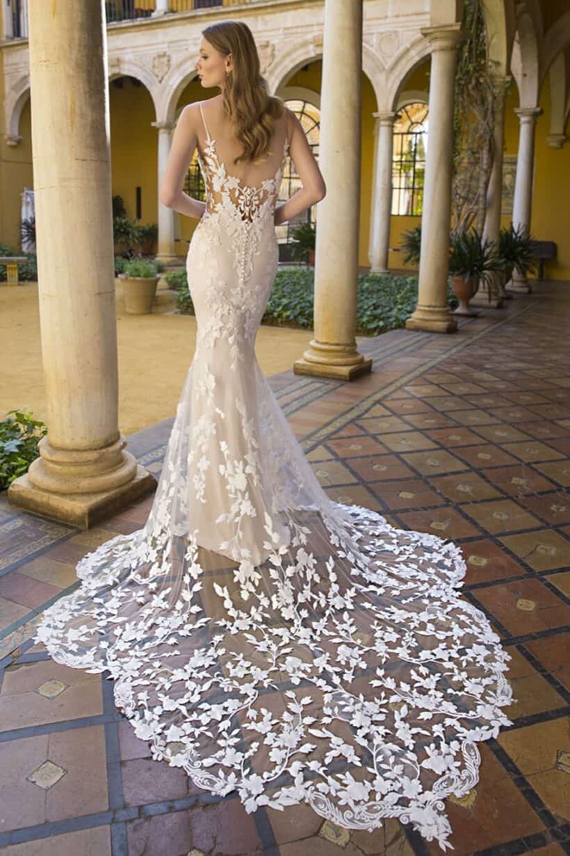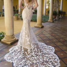 Az Enzoani Petal menyasszonyi ruha elegáns és modern megjelenést biztosít. A sellő szabás finoman követi az alakot. Kiemeli a nőies vonalakat. A levélmintás csipke különleges textúrát ad. A sztreccs zsorzsett és tüll anyag kényelmes viseletet biztosít. A térd alatt lágyan bővülő szoknya nőies hatású. A hímzett csipke uszály drámai megjelenést teremt.