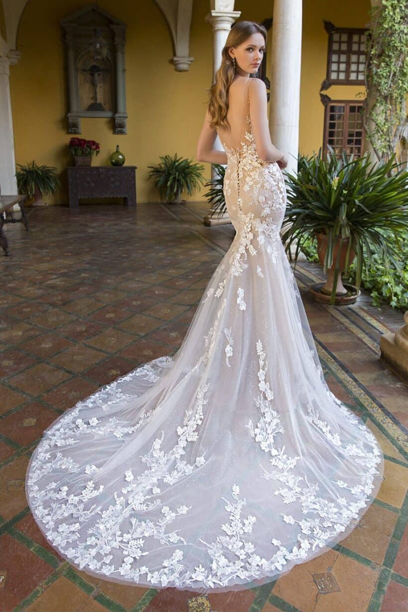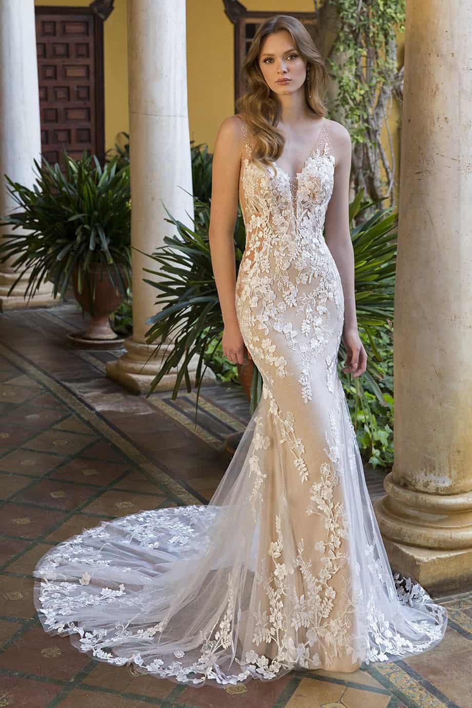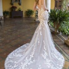 Az Enzoani Pierce menyasszonyi ruha romantikus és érzéki megjelenést biztosít. A sellő szabás finoman követi az alakot. Kiemeli a derekat és a csípőt. Az illúzió tüll pántok sejtelmes hatást adnak. Az áttetsző csipkefelsőrész modern és nőies. A csillogó tüll borítás mozgás közben ragyog. A részletgazdag csipkedíszítés elegáns textúrát teremt.