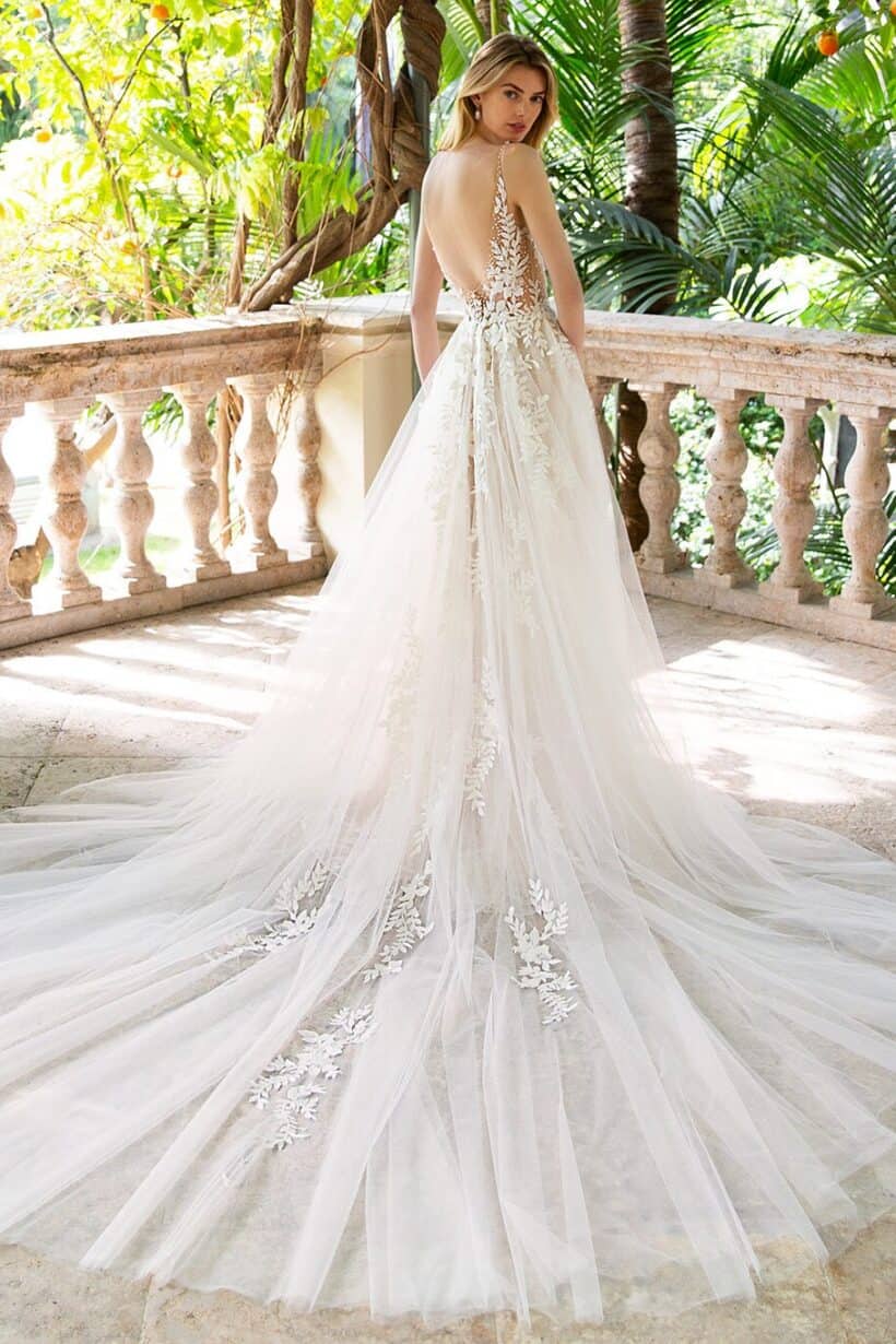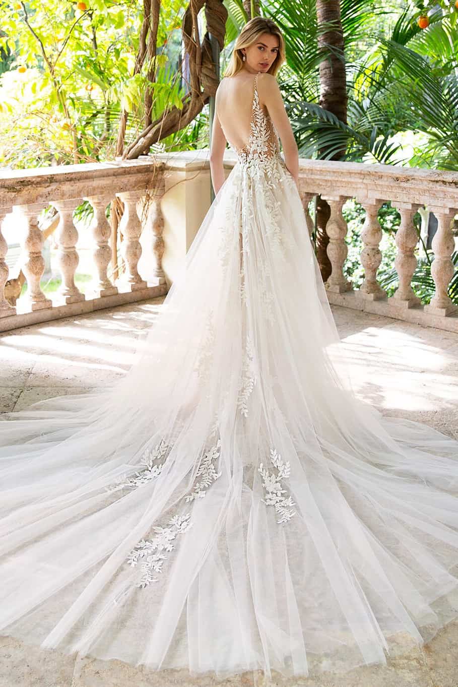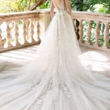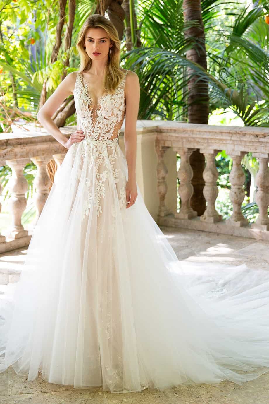 Az Enzoani Riva – Csillogó tüll szoknyás A-vonalú esküvői ruha a Enzoani kollekció egyik látványos modellje, amely most kiárusítás keretén belül érhető el. A mély V-kivágás nőies megjelenést ad, míg a testszínű tüll betétek stabil tartást biztosítanak. A flitteres tüll szoknya minden mozdulatnál ragyogó hatást kelt.