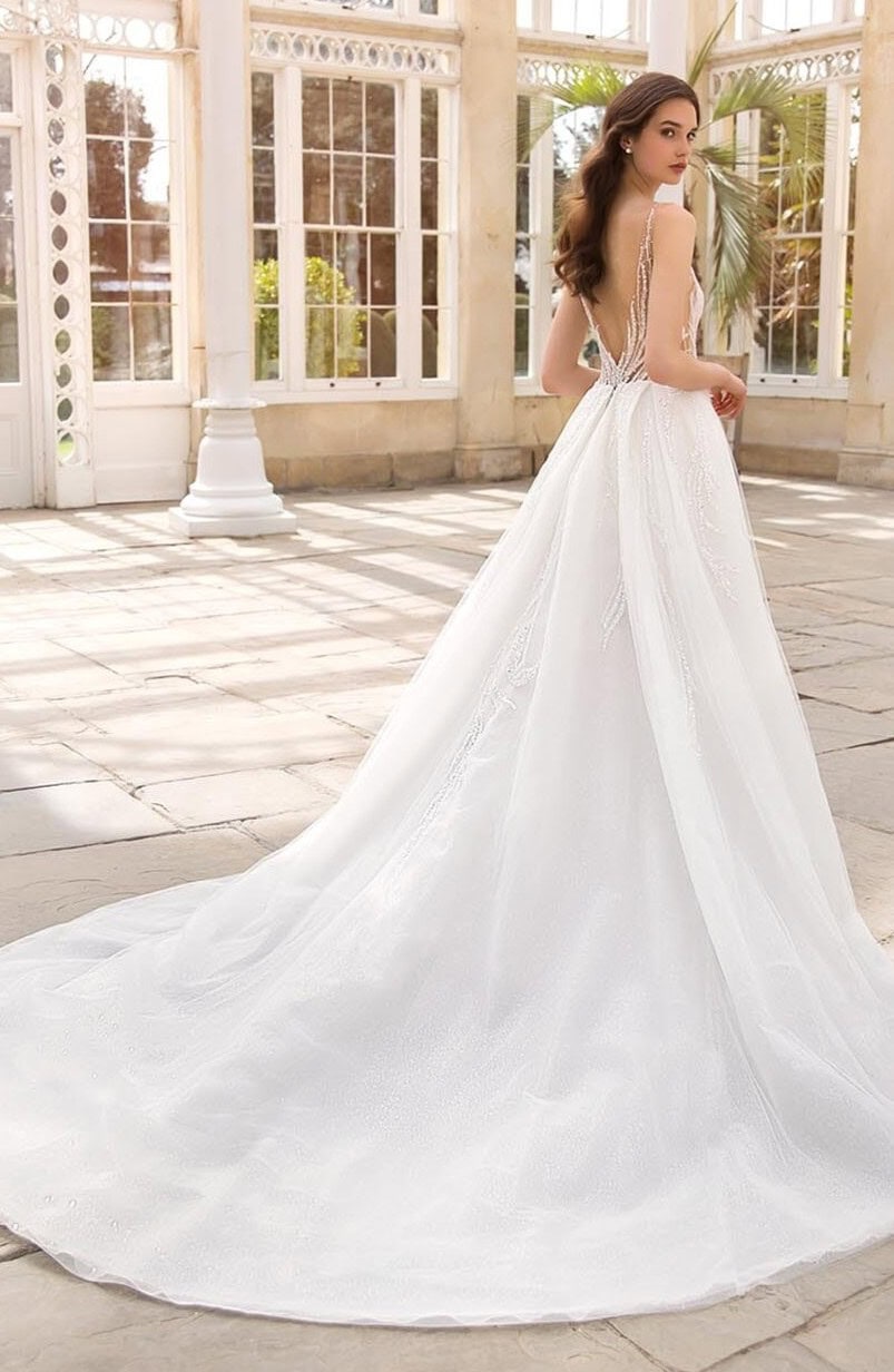 Az Enzoani Scarlett – Glamorous A vonalú esküvői ruha csillogó tüllel és geometriai csipkével a Enzoani kollekció feltűnő modellje. A ruha most kiárusítás keretén belül érhető el. A flitteres tüll és organza szoknya ragyogó hatást ad. Az elöl felvágott rész modern és érzéki megjelenést teremt.