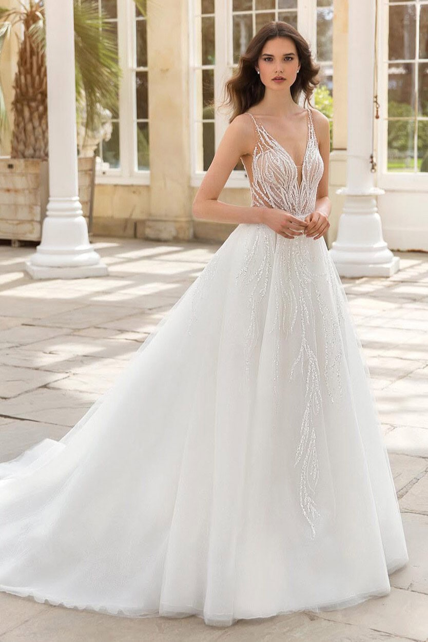 A mély dekoltázsú, geometrikus csipkével díszített míder szépen kiemeli a felsőtest vonalát. Az uszályt csillogó díszítés teszi még látványosabbá. Az Enzoani Scarlett ideális választás, ha klasszikus szabást szeretnél modern, glamour hatással. A modell felpróbálható az Eklektika Esküvői Ruhaszalon szalonban.