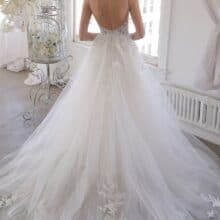 A mélyen kivágott nyitott hát látványos, mégsem hivalkodó megoldás, ami tovább erősíti a ruha romantikus, ugyanakkor modern karakterét. Az „Omara” tökéletes választás lehet szabadtéri vagy akár elegáns, klasszikus esküvőkre is, minden évszakban.