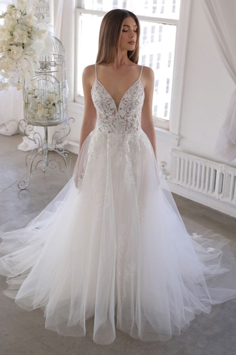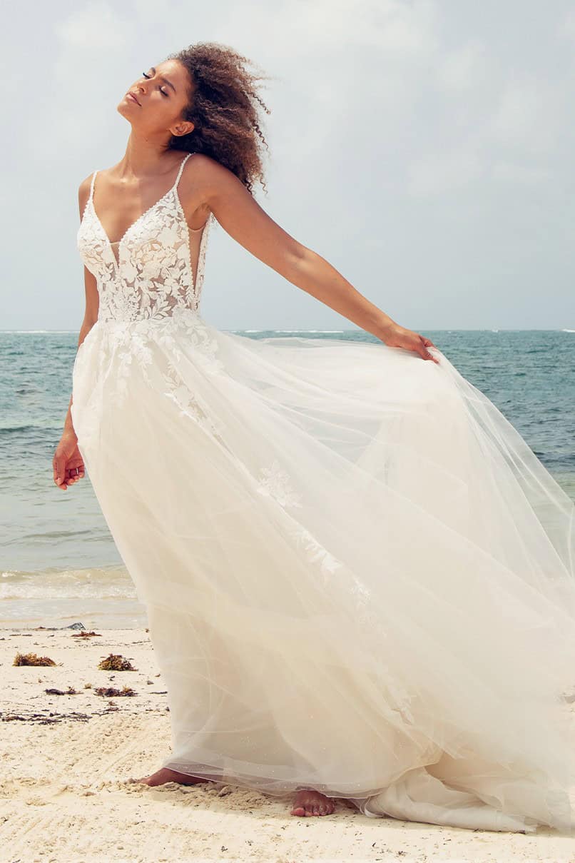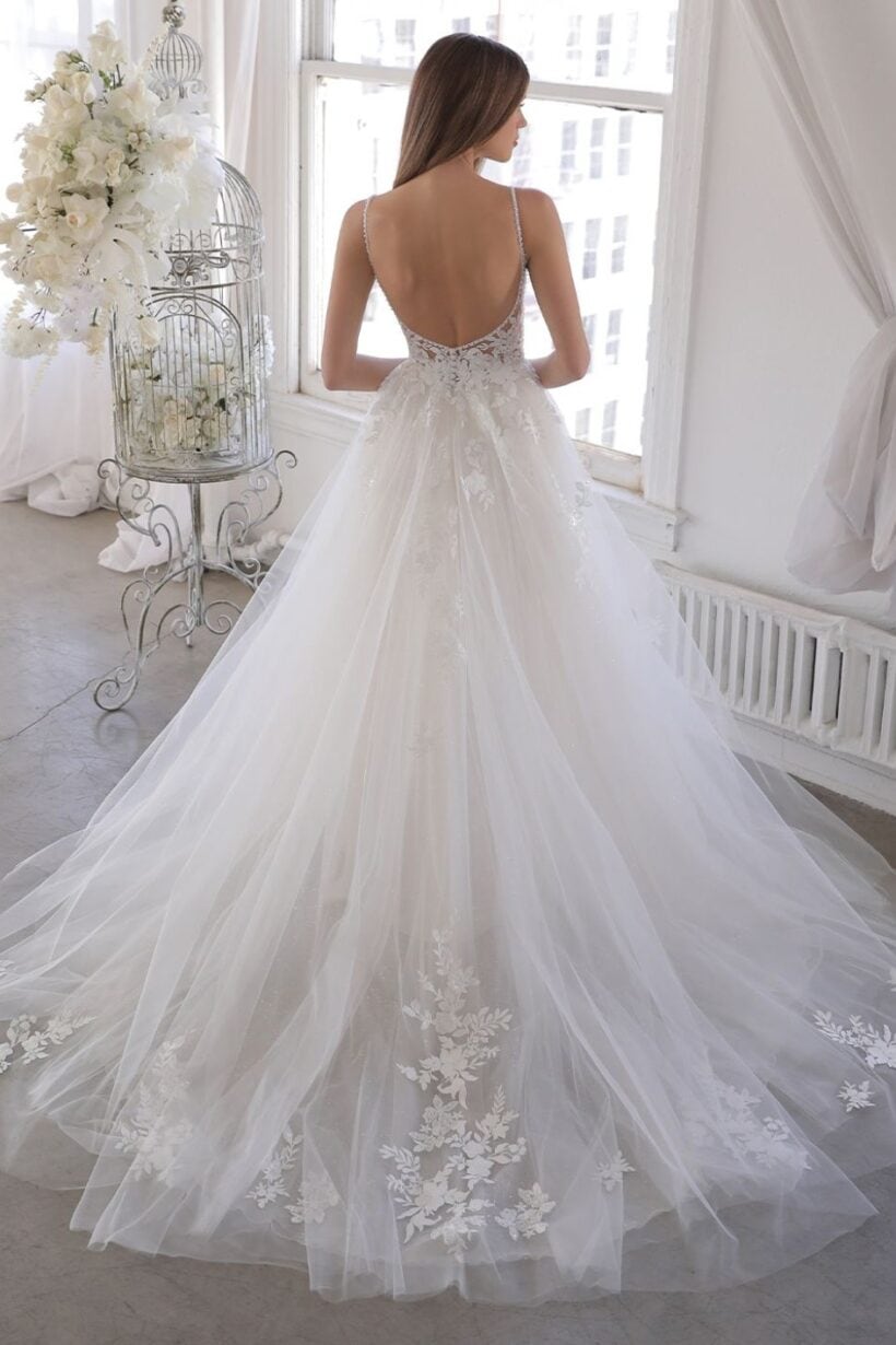 A mély szív alakú dekoltázs gyönyörűen kiemeli a felsőtestet, miközben a vékony spagettipántok légies tartást biztosítanak. A mellrészt látványos, hímzett virágcsipke borítja, amely részletgazdagságával elegáns és mesés hatást kelt. A ruha szoknyája puha tüll- és organzaretegekből épül fel, csillámló tüllrétege pedig finom ragyogással teszi különlegessé a mozgást és a fényjátékot.