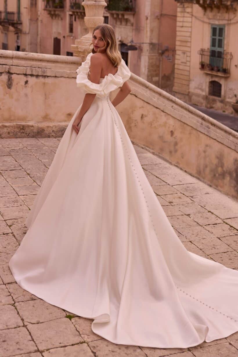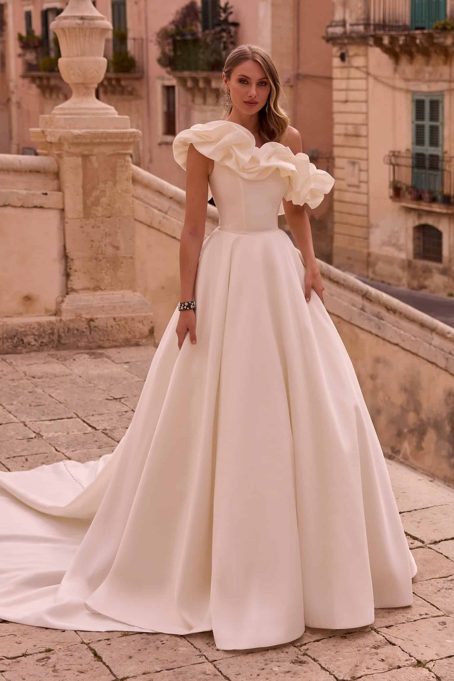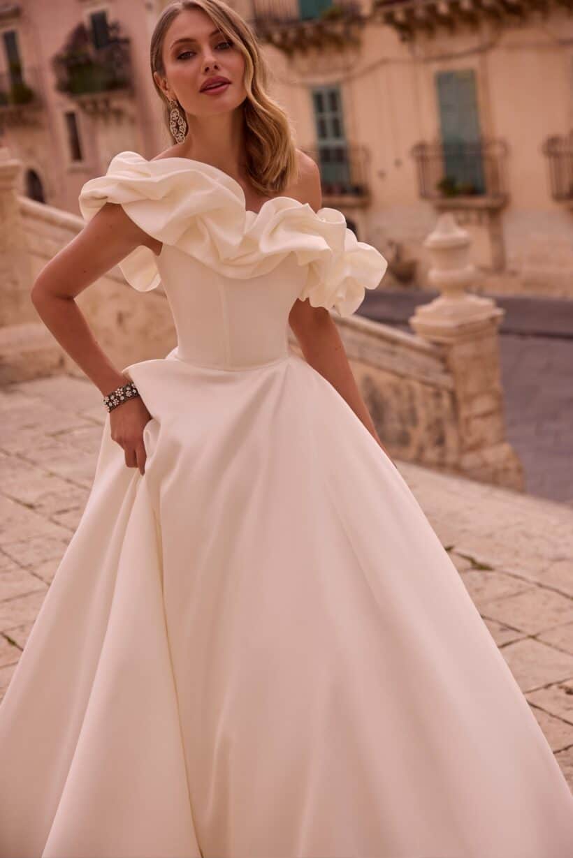 A félvállas menyasszonyi ruha az egyik legizgalmasabb választás a modern menyasszonyok számára. Egyszerre merész és kifinomult, ezért tökéletes azoknak, akik szeretnének eltérni a hagyományos fazonoktól, mégis elegáns megjelenésre vágynak.