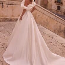 A szabás nemcsak látványos, hanem rendkívül nőies is. Finoman követi az alakot, majd elegánsan bővülő szoknyában folytatódik, amely légies hatást kelt járás és tánc közben. Egy jól megtervezett félvállas menyasszonyi ruha egyszerre biztosít stabil tartást és kényelmes viseletet, így felszabadultan élvezheted a nagy nap minden pillanatát.
