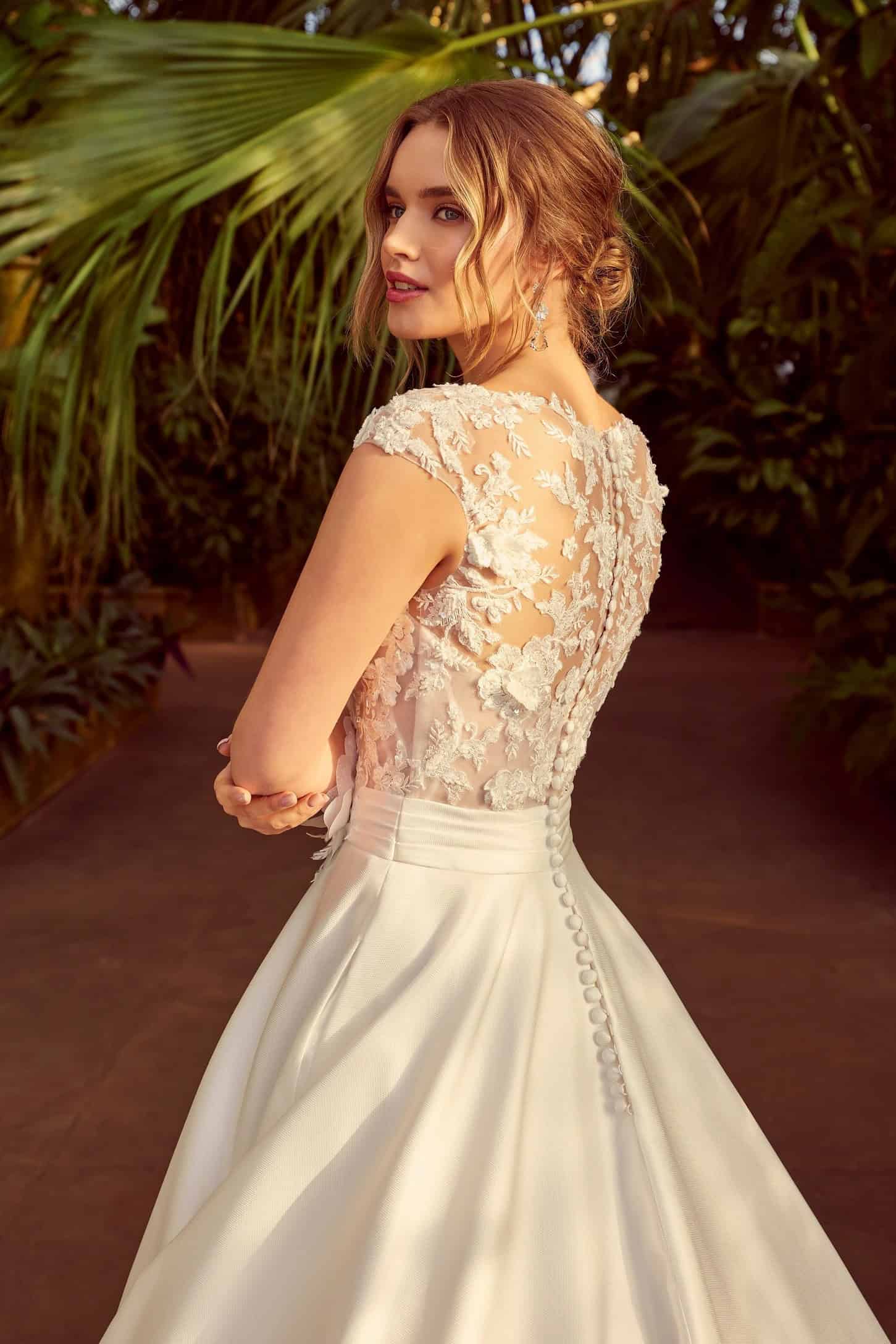 A felsőrész illúzió csipkés kialakítása finoman takarja a vállakat, és romantikus megjelenést biztosít. A részletgazdag csipkedíszítés nőies hangsúlyt ad, miközben elegáns egyensúlyt teremt a letisztult anyaghasználattal. Ez a megoldás különösen előnyös azok számára, akik kifinomult, mégis visszafogott megjelenést szeretnének.