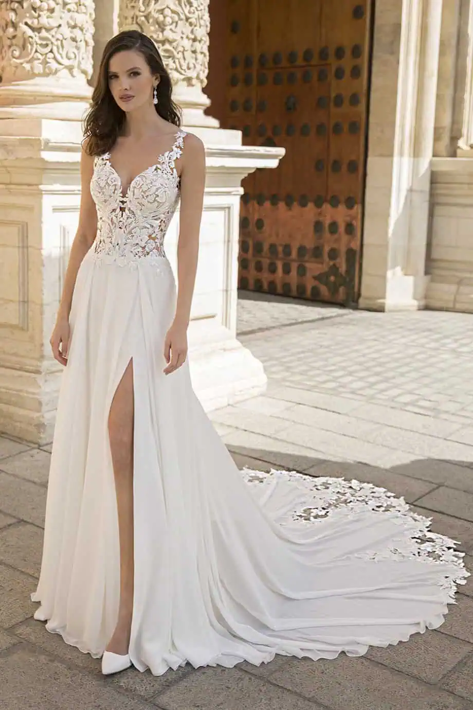 Étoile „Charisse” – lenge esküvői ruha csipkefelsővel és szexi sliccel