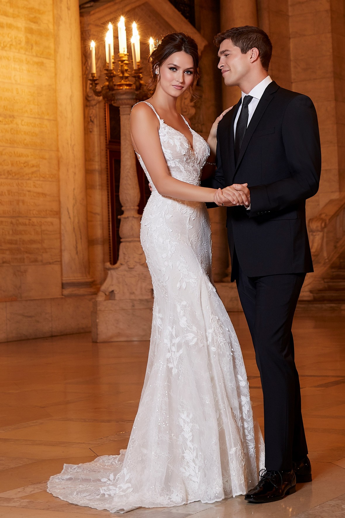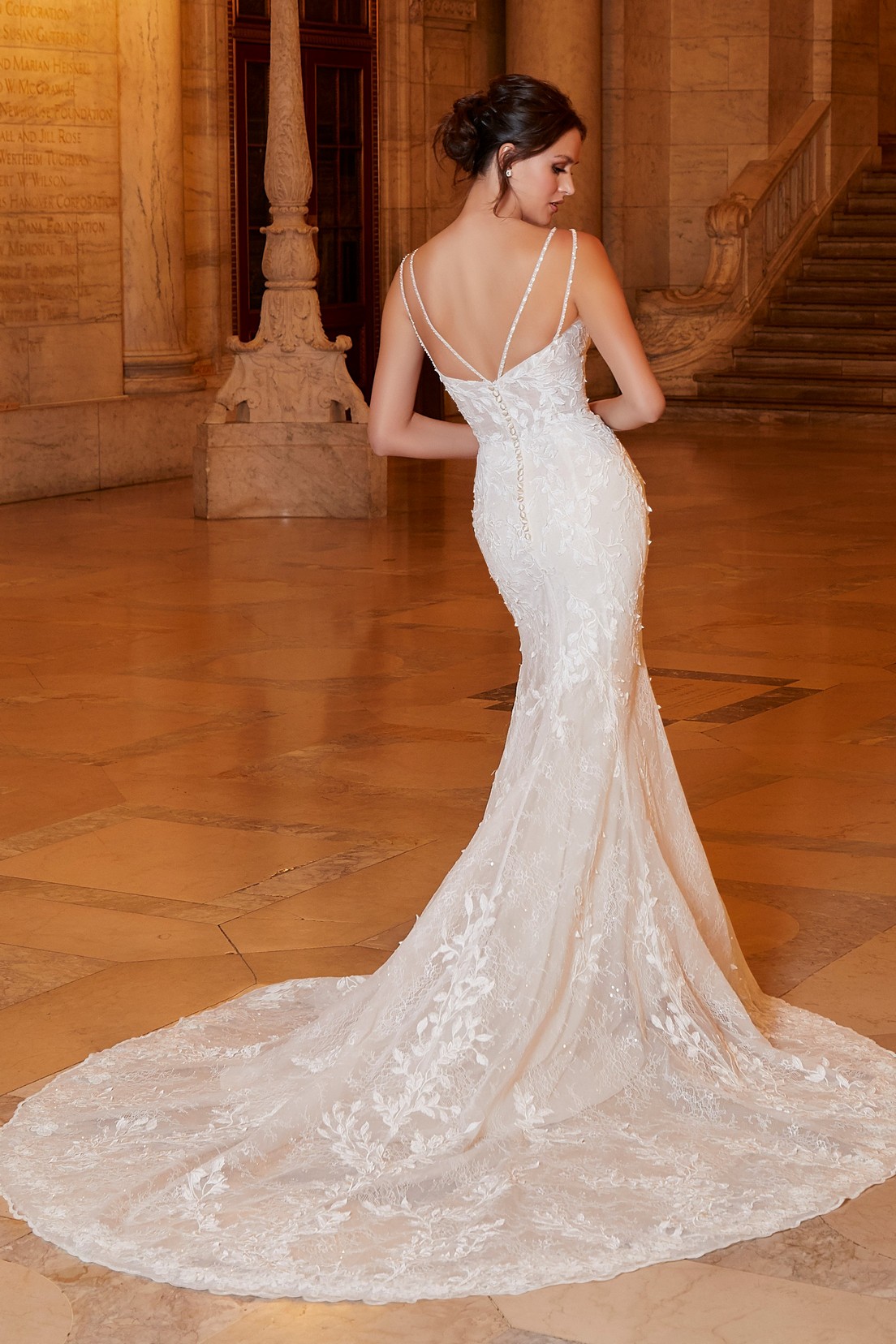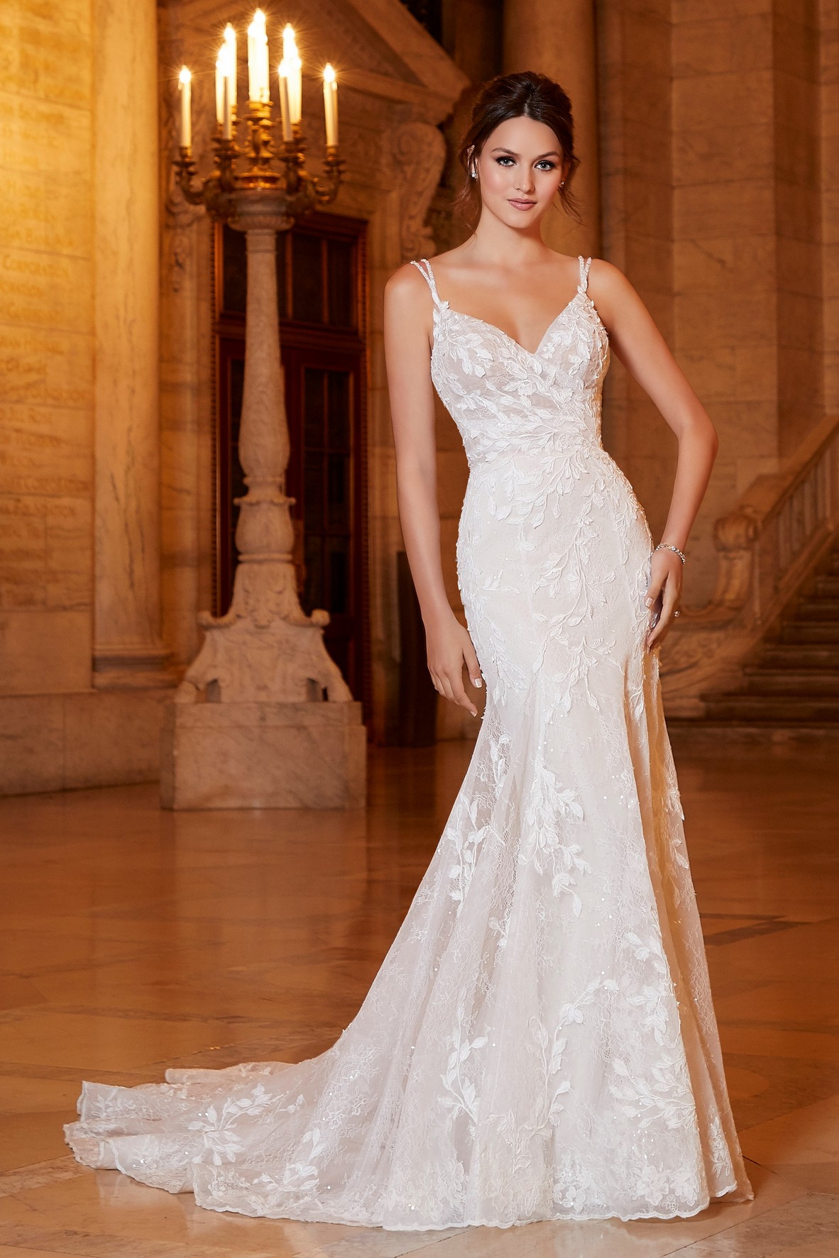 A Madeline Gardner Arkadia menyasszonyi ruha luxus és elegáns megjelenést kínál. A sellő szabás finoman követi az alakot. A Chantilly csipke romantikus textúrát ad. A háromdimenziós hímzés látványos részlet. A V-kivágás nőies hangsúlyt teremt. A vékony vállpántok légies hatást biztosítanak. A sziluett kifinomult és exkluzív.
