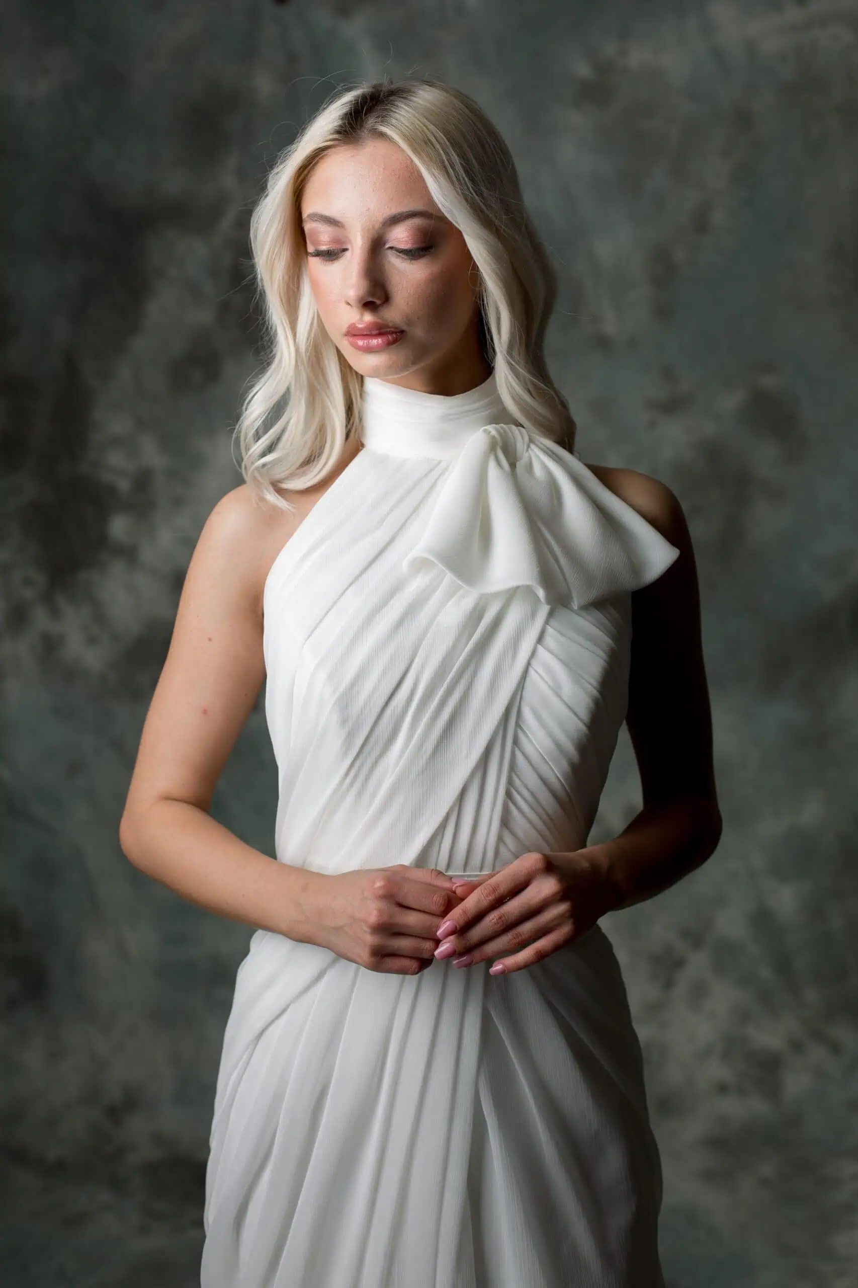 Magas nyakú, lágy esésű menyasszonyi ruha – Pronovias görög istennő stílusban