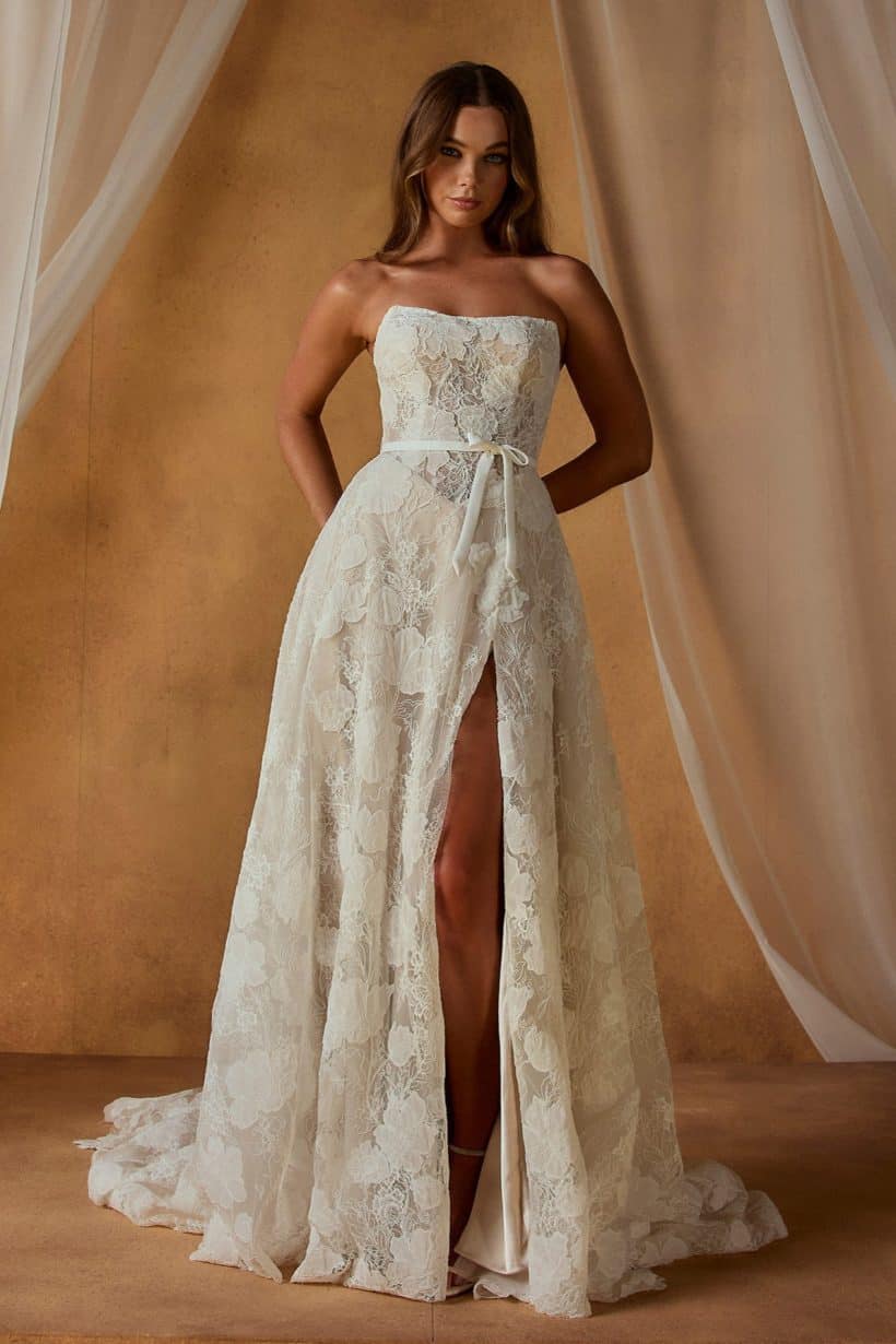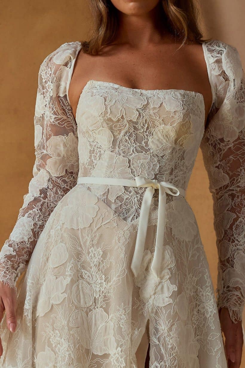 A Nava azoknak a menyasszonyoknak készült, akik szeretik a csipkét, a strukturált vonalakat és a finoman divatos részleteket. Ez a menyasszonyi ruha levehető ujjal egyszerre romantikus, modern és emlékezetes választás a nagy napra.