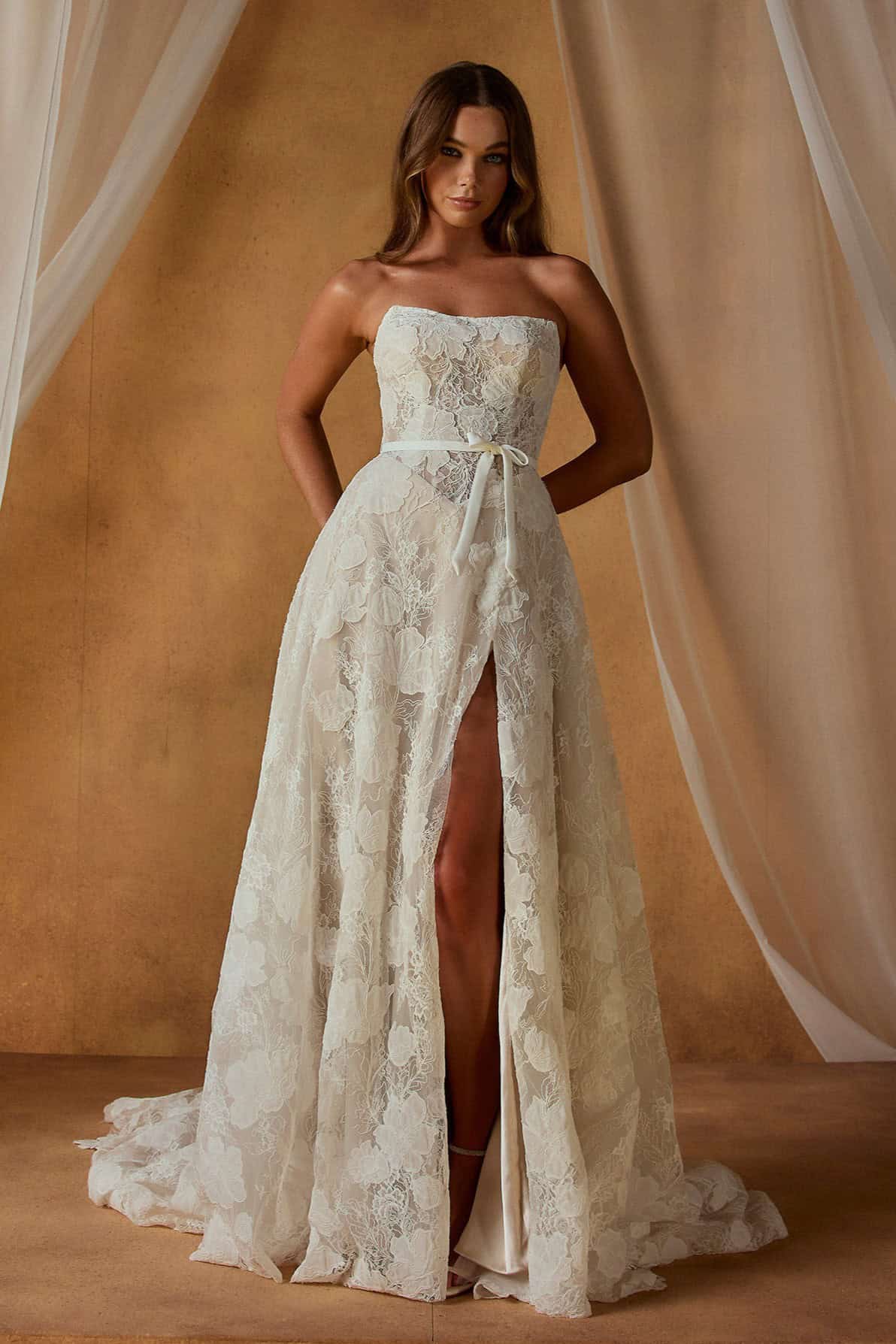A szoknya slimline A-vonalú kialakítású, lapos elülső résszel, amely letisztult és modern hatást kelt. A rétegzett, vegyes virágmintás csipke lágy dimenziót ad az összhatásnak. A finom combhasíték kortárs karaktert visz a modellbe, miközben megőrzi annak romantikus eleganciáját. Az uszály látványos, mégis kifinomult lezárást biztosít.
