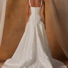 A szoknya lágyan redőzött kialakítása extra volument ad, miközben megőrzi a mikádó anyag strukturált esését. Hátul egy látványos, köríves uszály teszi teljessé az összhatást, amely klasszikus menyasszonyi karaktert kölcsönöz a ruhának.