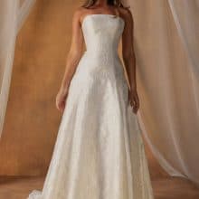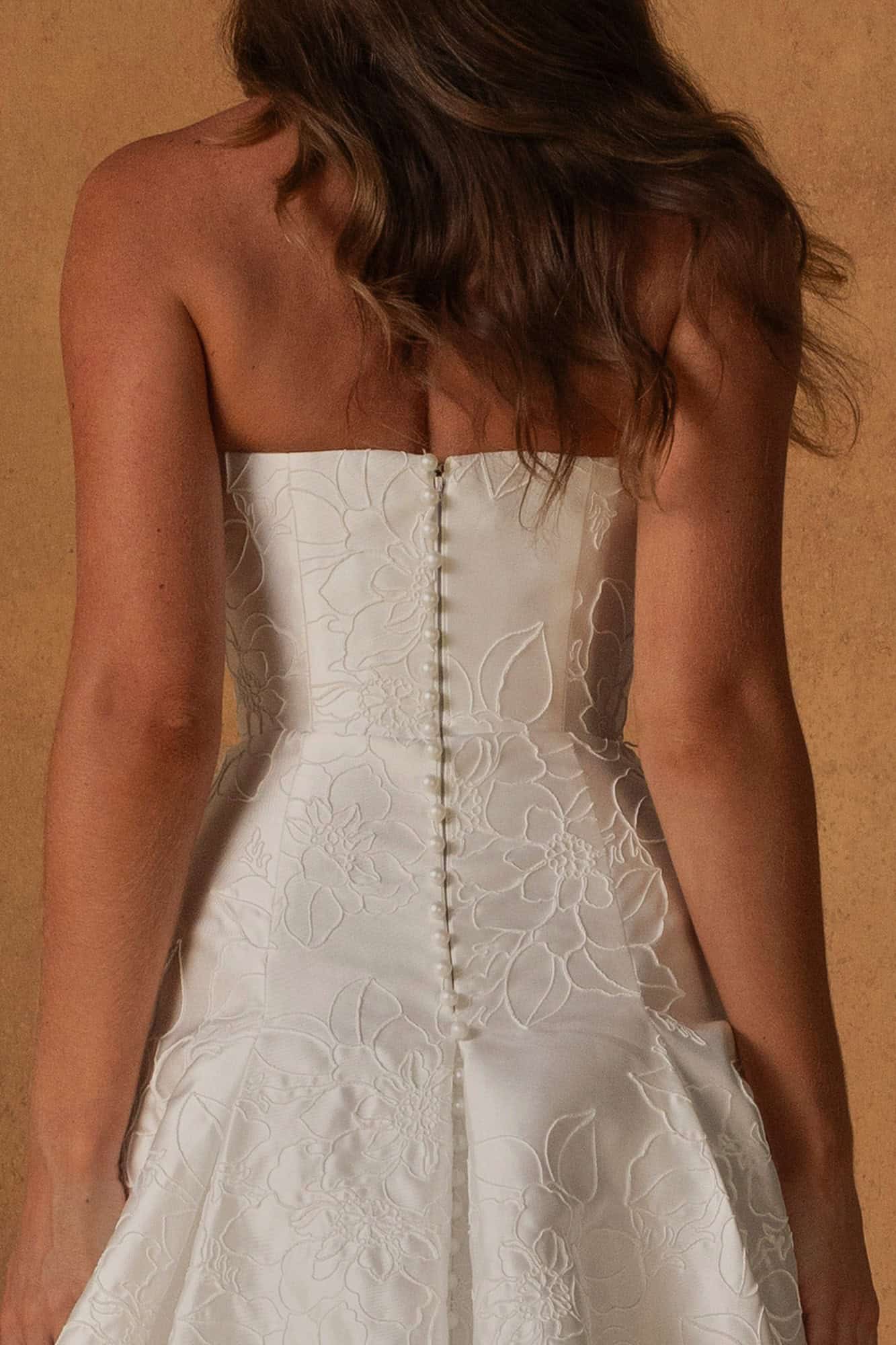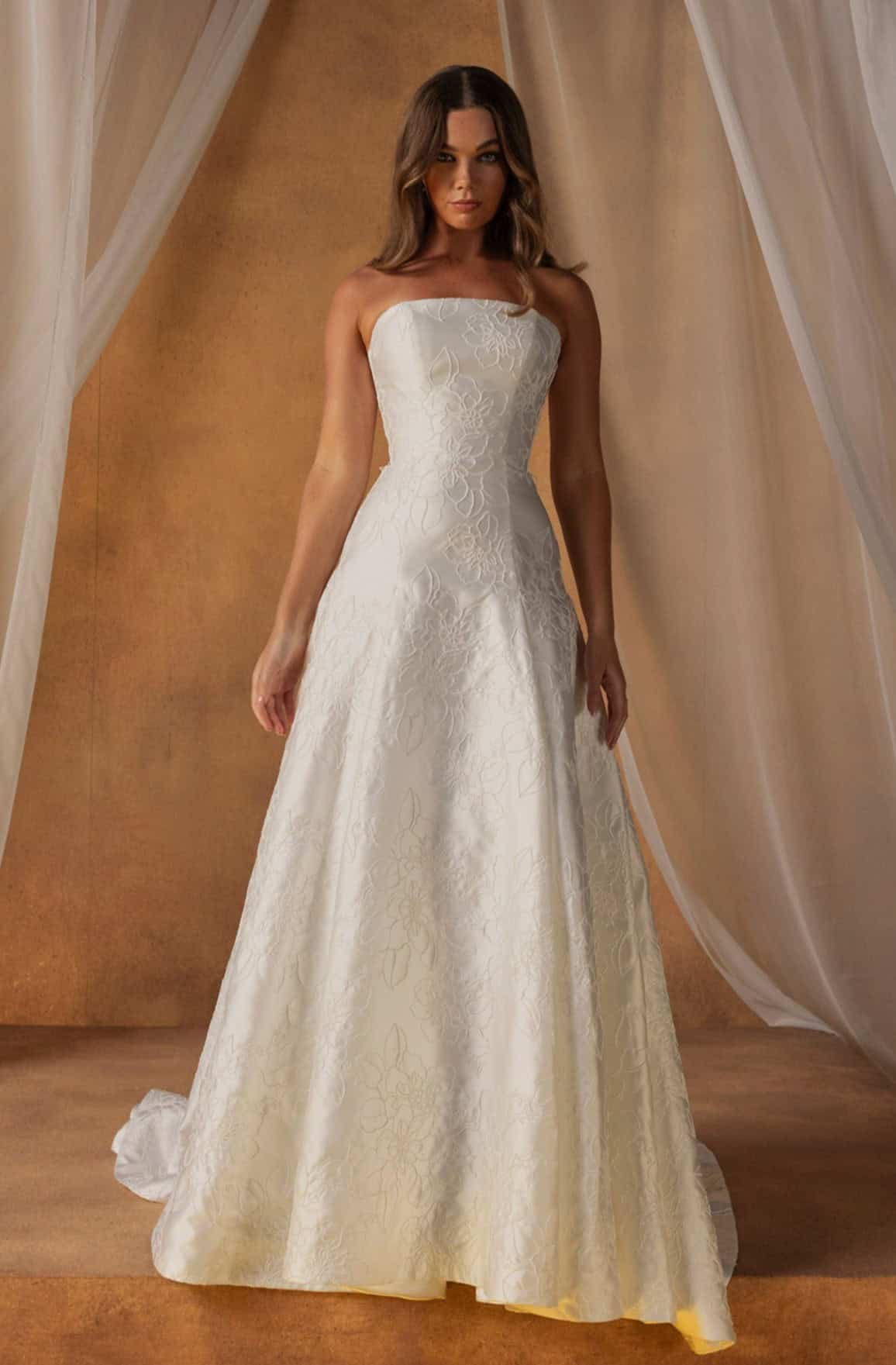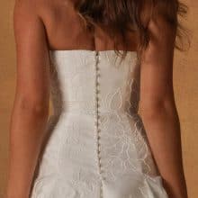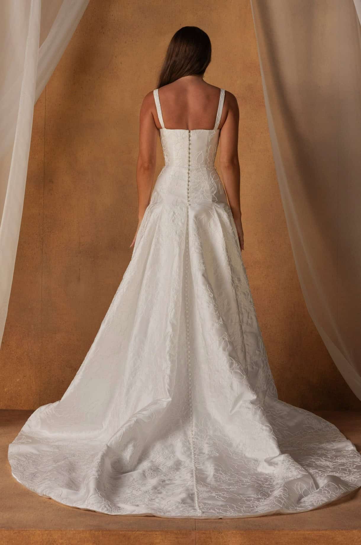A ruha kordonozott mikádóból készült, amely tiszta, elegáns alapot ad a dizájnnak. Ez az anyag tökéletes „vászonként” szolgál a visszafogott részletekhez, így a ruha megőrzi letisztult karakterét, miközben különleges marad. A Normandy kifejezetten azoknak készült, akik az egyszerűségben látják a luxust.