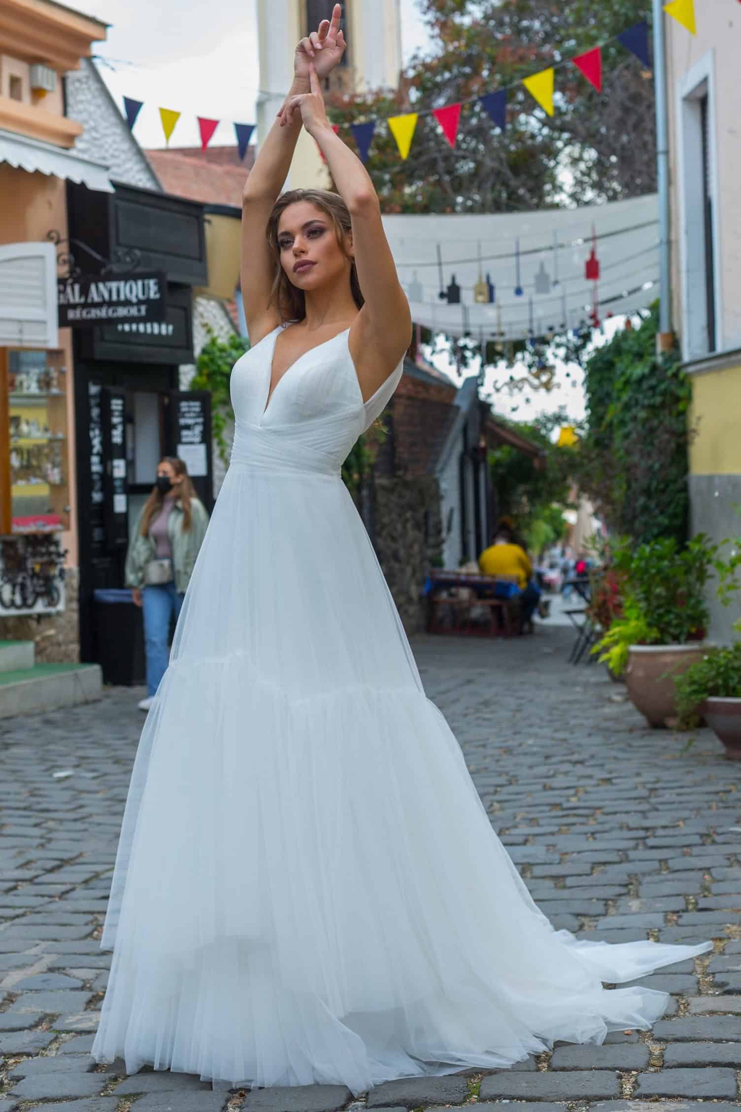 A ruha réteges, könnyed tüll szoknyája látványosan mozog minden lépésnél. A légies anyag szépen követi a mozdulatokat, így különösen elegáns hatást kelt tánc közben. Ez a fazon ideális választás keringőre vagy nyitótáncra is.