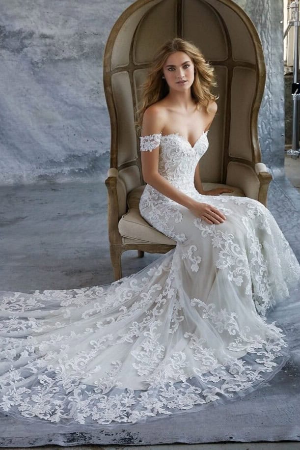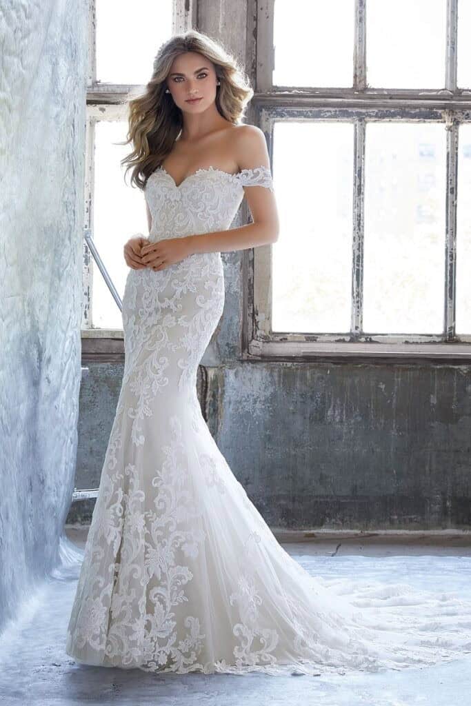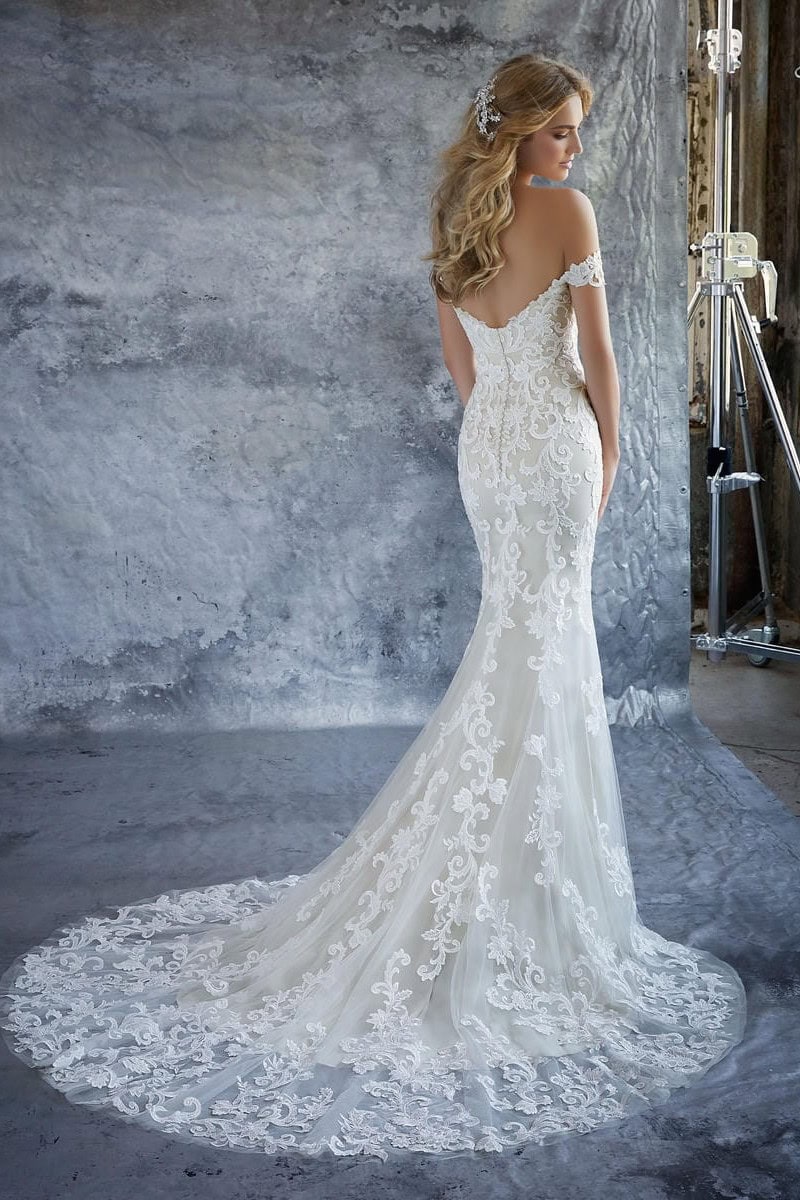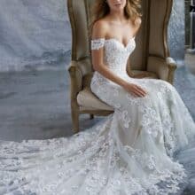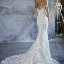 A Morilee Kassia menyasszonyi ruha elegáns és romantikus megjelenést kínál. A sellő szabás finoman követi az alakot. A térd felett lágyan bővülő szoknya klasszikus sziluettet ad. A teljes felületet részletgazdag csipke borítja. A virágminták textúrát és mélységet teremtenek. Az ejtett vállú felsőrész kiemeli a dekoltázst és a vállakat. A belső merevítések stabil tartást biztosítanak. A hátsó uszály látványos hatást kelt mozgás közben.